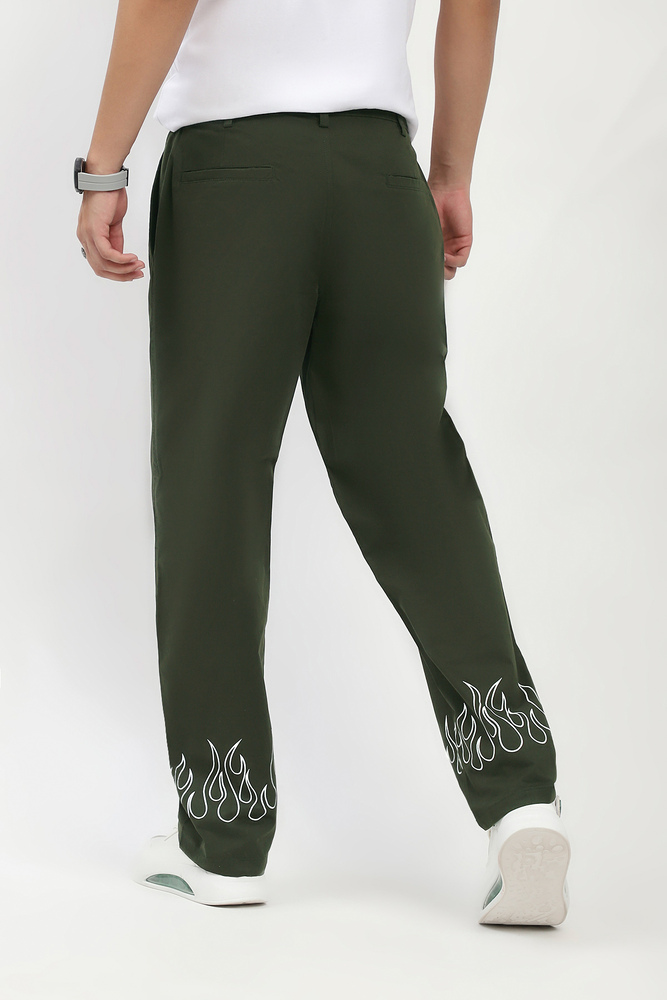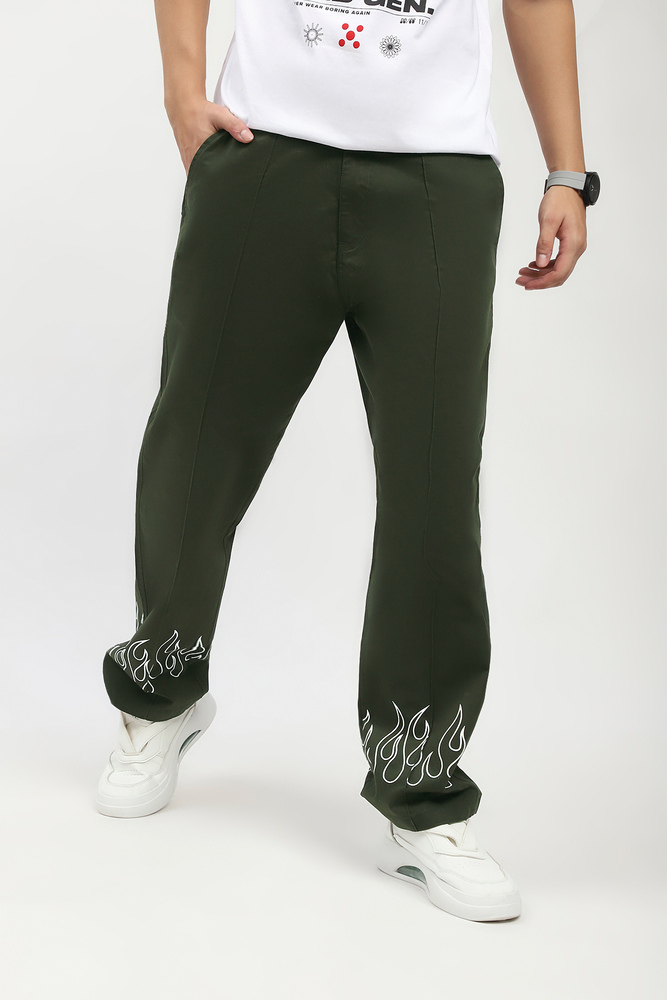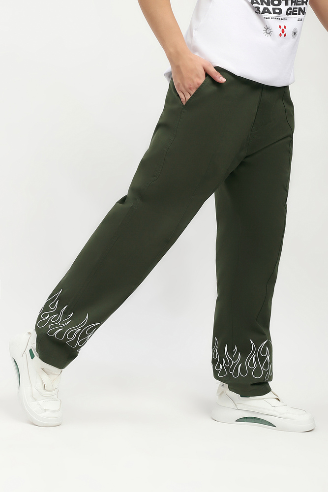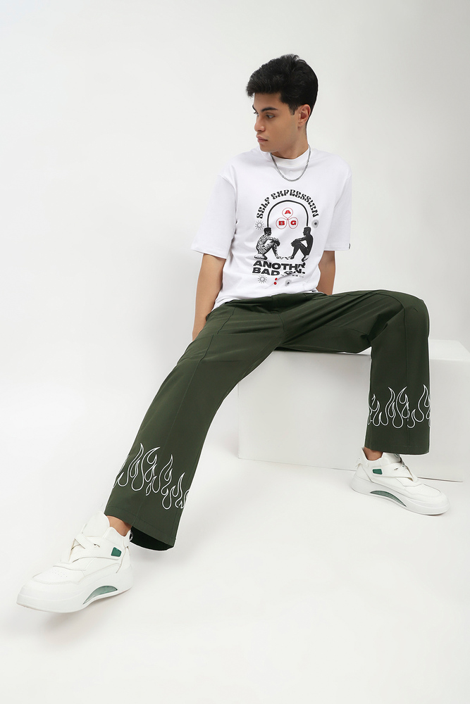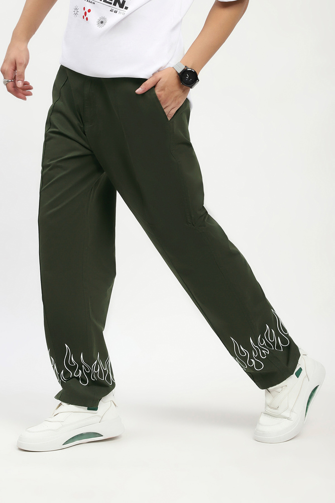 Ignite your streetwear game with these baggy cargo pants, crafted from rugged twill fabric and finished with a bold fire print along the bottom hem. Designed with a relaxed, oversized fit and sharp pintuck detailing down the front, these cargos bring heat and structure in equal measure. Whether you are stepping out or standing out, these pants deliver effortless cool with a functional edge. Model height is 6.1 feet and wearing 32 size. Disclaimer Please note that the color of the product shown on the website may differ slightly from the actual product due to factors such as lighting and screen display.