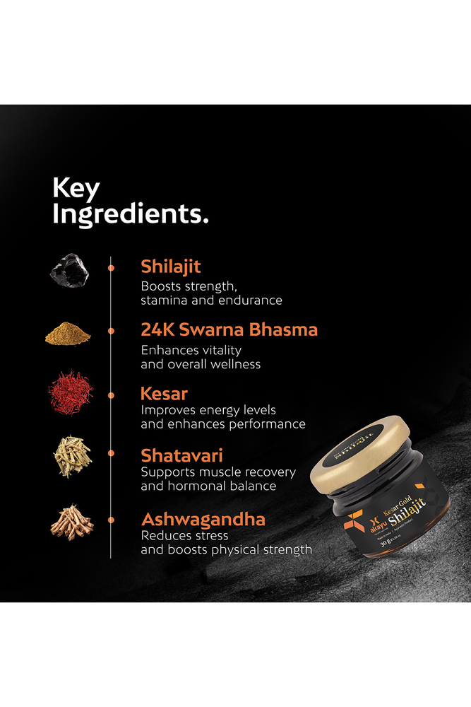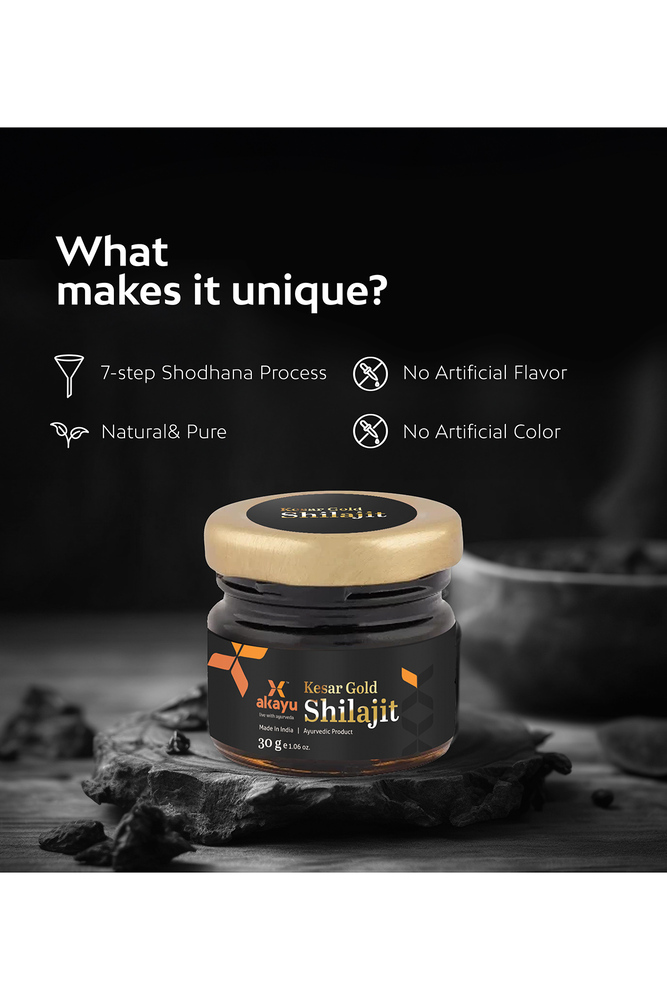 Akayu Kesar Gold Shilajit is a premium Ayurvedic formulation designed to revive energy, enhance stamina, and promote overall well being. With a blend of potent ingredients like Swarna Bhasma, Saffron, and Shilajit, this unique product enhances muscle recovery, mental clarity, and physical strength, making it perfect for active lifestyles.