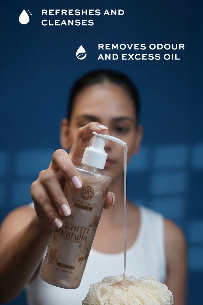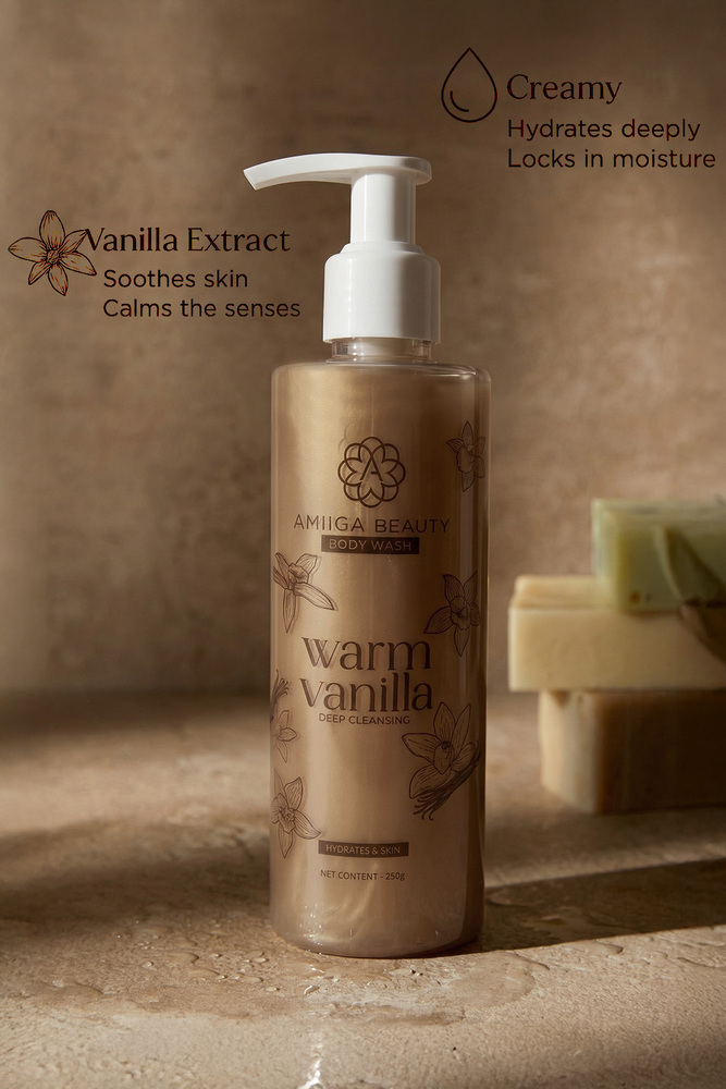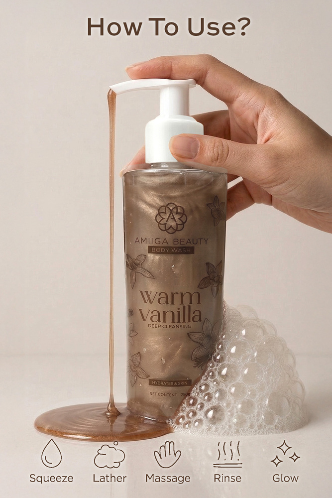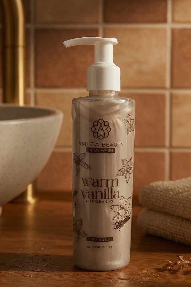 Indulge your senses with the soothing embrace of Amiiga Beauty Warm Vanilla Body Wash. Infused with the rich, comforting aroma of warm vanilla, this luxurious body wash gently cleanses while leaving your skin feeling soft, nourished, and delicately scented. Its creamy lather pampers your skin, locking in moisture and providing a spa like experience with every use. Perfect for all skin types, this body wash transforms your daily shower into a moment of calm, warmth, and self care. Key Features Enriched with the comforting scent of warm vanilla, Gentle, moisturizing formula suitable for all skin types, leaves skin clean, smooth, and lightly fragranced, Ideal for daily use. Treat yourself to a warm, cozy cleanse your skin will thank you. Ingredients Aqua, Sodium Laureth Sulfate, Cocamide MEA, Cocamidopropyl Betaine, Glycol Distearate, Glycerine, Sorbitol, Polyquaternium 7, Dimethyl Dimethyl Hydantoin, Sodium Chloride, Perfume, Ethylene Diamine Tetra Acetic Acid, Fragrance, CI 16255, CI 19140, CI 42090.
