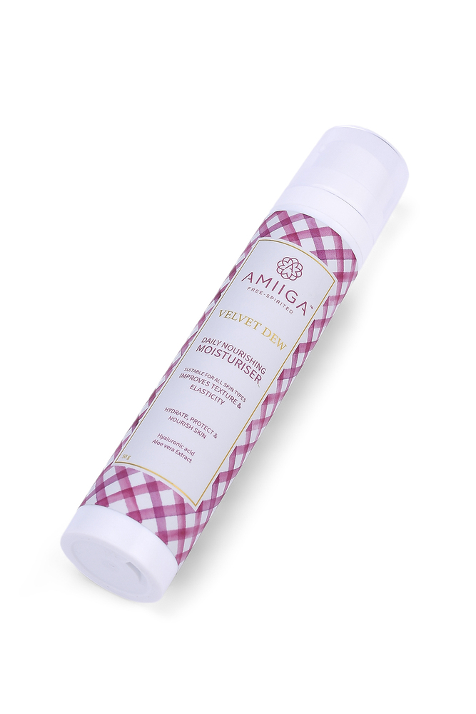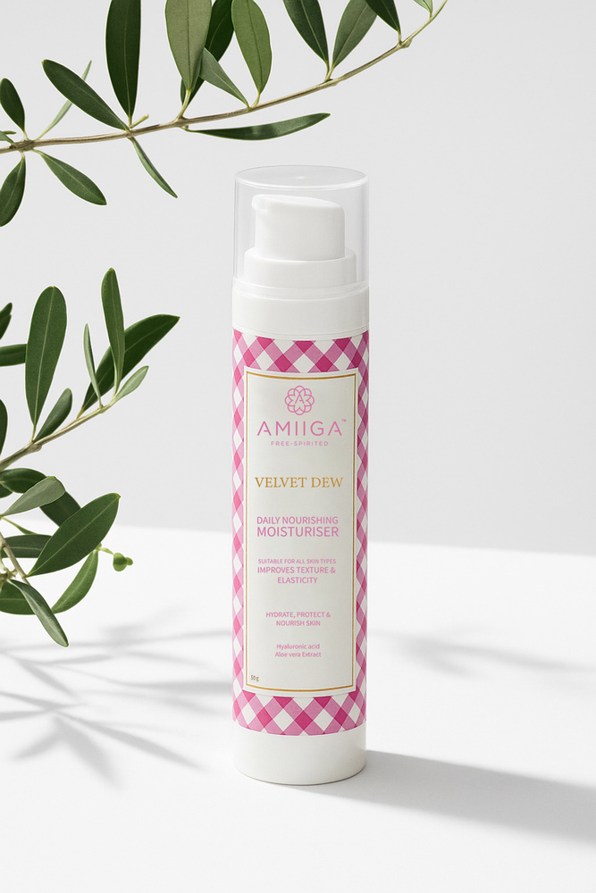 Indulge your skin with the lightweight luxury of Amiiga Beauty’s Velvet Dew Moisturiser. This gel based formula delivers a surge of hydration without feeling heavy or greasy, making it ideal for all skin types especially oily and combination skin.Infused with skin loving botanicals and soothing actives, Velvet Dew sinks in instantly, locking in moisture while calming irritation and balancing oil production. The result . A fresh, velvety finish and a natural, healthy glow. Key Benefits Lightweight gel texture absorbs quickly without clogging pores, Provides long lasting hydration and plumps the skin, Helps soothe redness and calm inflammation, Leaves skin smooth, soft, and dewy all day . Perfect as a base under makeup or as part of your daily skincare routine, Amiiga Beauty’s Velvet Dew is your go to for effortless, breathable hydration. Ingredients Water, Propanediol, Butylene Glycol, Sodium Acrylates Copolymer (and ) Parraffinum Liquidum, PPG 1 Trideceth 6, Phenoxyethanol, Hyaluronic acid, Ammonium Polypropylene Acyl Dimethyl Taurine, Aloe vera extract, Perfume, Disodium Ethylene Diamine Tetraacetic Acid, CI 42090.