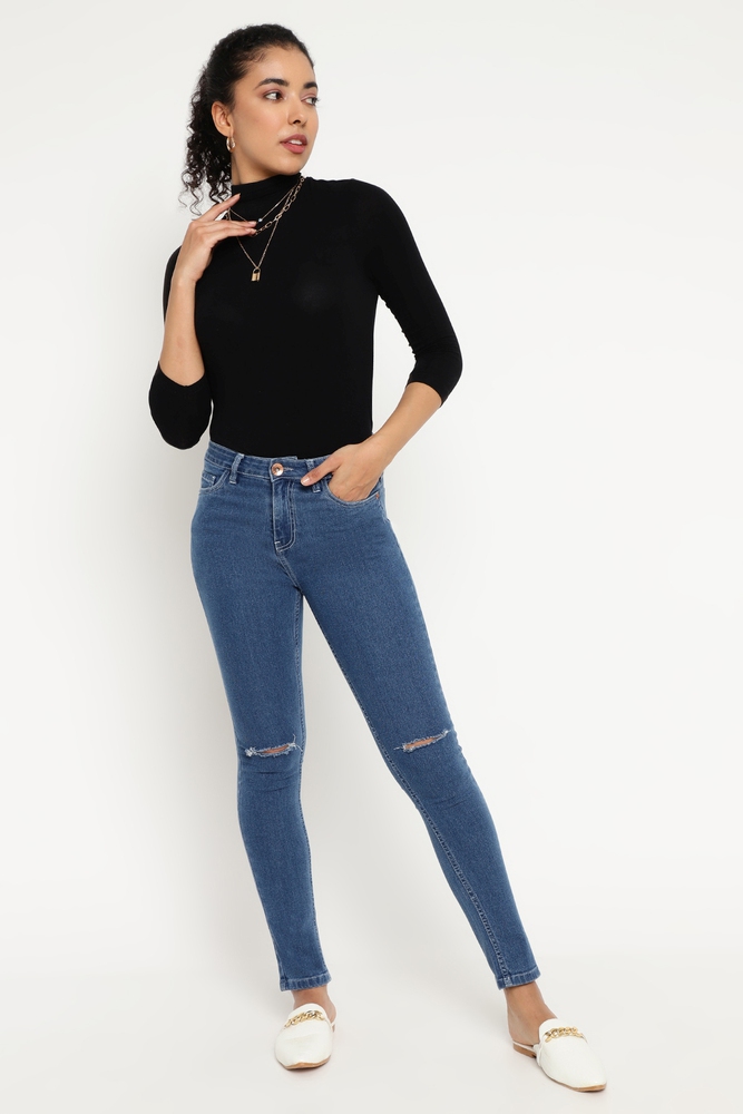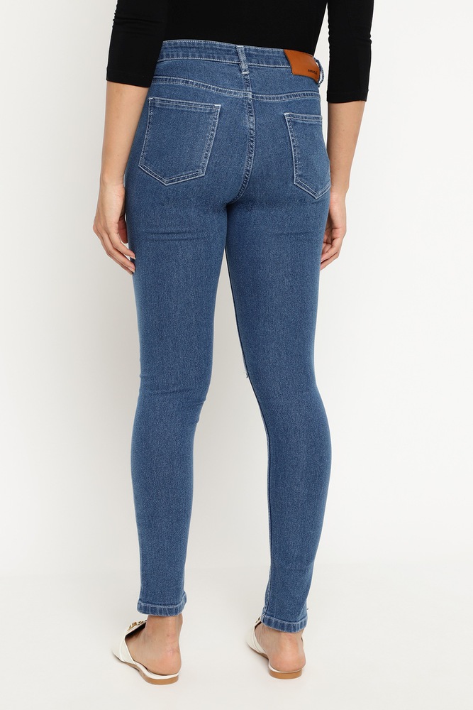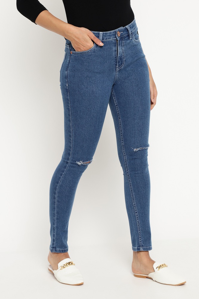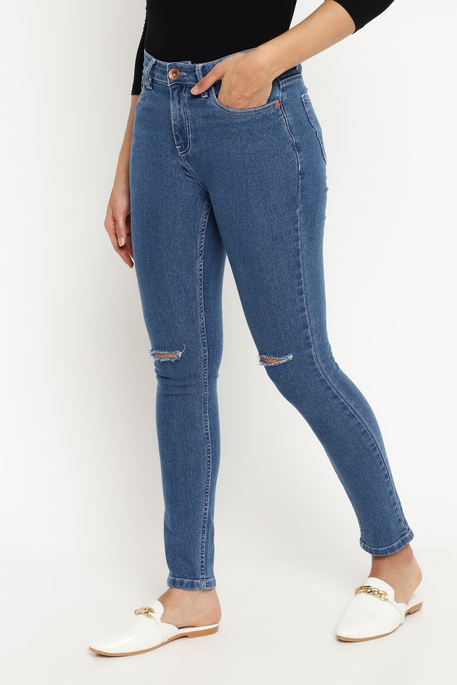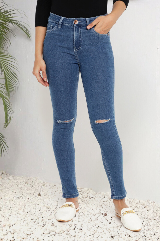 Womens Blue Distress Jeans are a classic must have for any wardrobe. These jeans are crafted from a comfortable cotton lycra with just the right amount of stretch, making them perfect for everyday wear. The blue color offers timeless style and versatility. Whether you are headed to work or out for dinner, these versatile Womens Blue Regular Jeans will keep you feeling stylish and confident all day long. Disclaimer Please note that the color of the product shown on the website may differ slightly from the actual product due to factors such as lighting and screen display.
