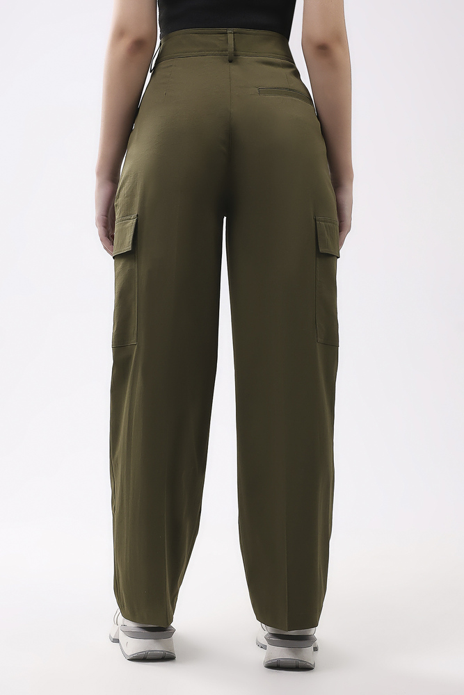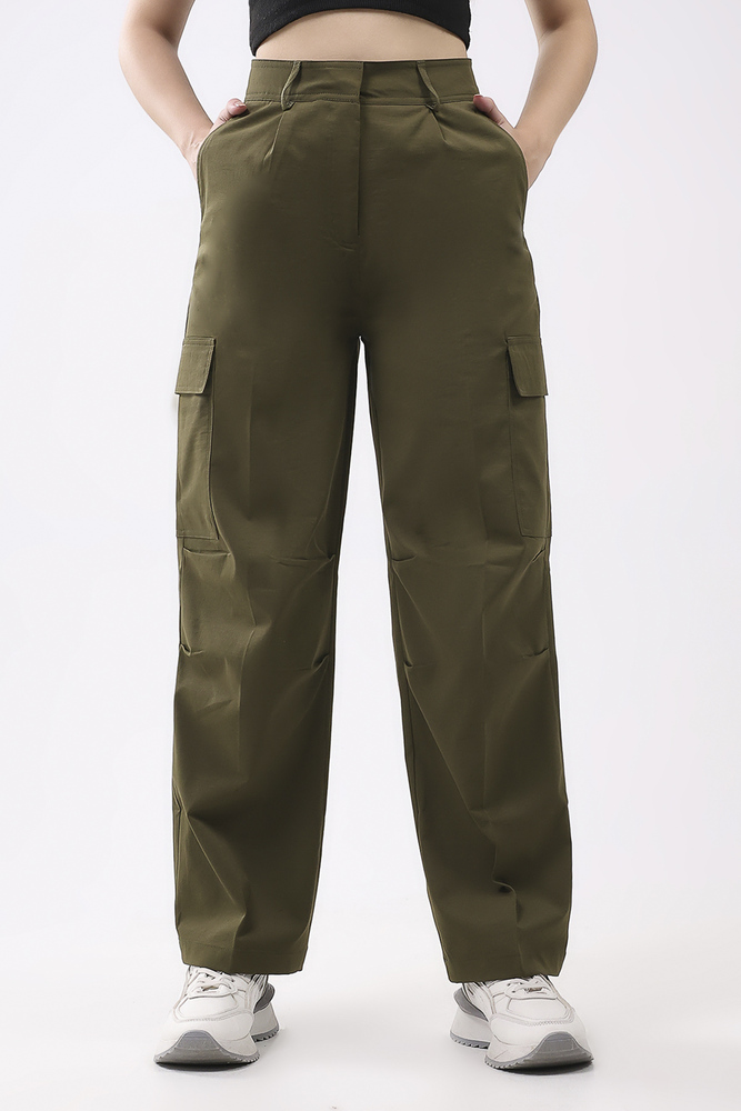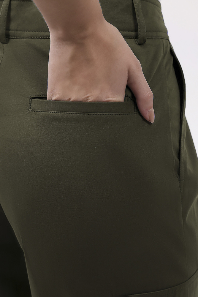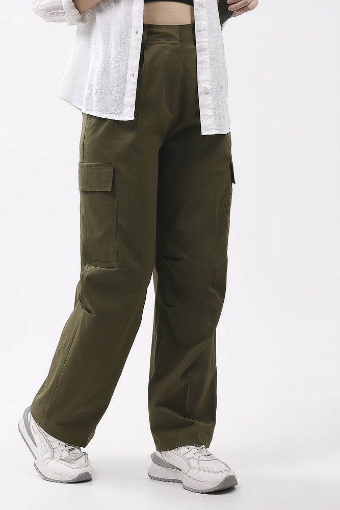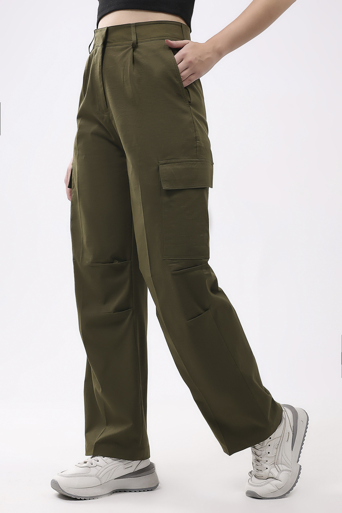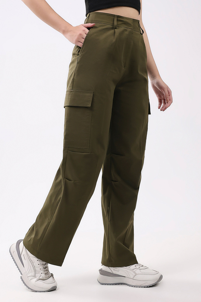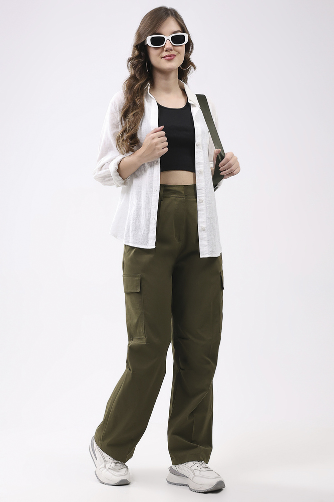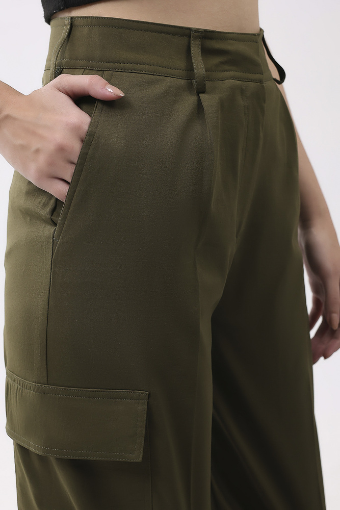 Upgrade your everyday wardrobe with these olive green cargo pants for women, crafted from stretchable twill lycra fabric for ultimate comfort and flexibility. Designed with a flattering high rise waist and multiple utility pockets, including side flap cargo pockets, these pants offer both style and functionality. Ideal for casual wear, travel, or outdoor activities, they pair effortlessly with crop tops, tee, or sweaTees. Model height is 5.7 feet and wearing 28 size. Disclaimer - Please note that the color of the product shown on the website may differ slightly from the actual product due to factors such as lighting and screen display.