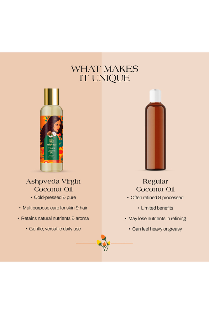 A pure, cold-pressed oil crafted to care for your skin and hair naturally. Ashpveda Virgin Coconut Oil is lightweight, deeply moisturizing, and rich in natural goodness that helps maintain softness and smoothness. Its fast-absorbing texture leaves no greasiness, making it ideal for daily self-care and nourishment.