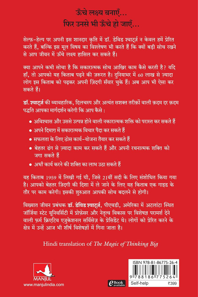 सेल़्फ हेल्प पर अपनी इस शानदार कृति में डॉ. डेविड श्वाट्र्ज़ न केवल हमें प्रेरित करते हैं, बल्कि इस मूल विषय का विश्लेषण भी करते हैं कि क्यों बड़ी सोच रखने से आप जीवन में ऊँचे लक्ष्य हासिल कर सकते हैं. क्या आपने कभी सोचा है कि सकारात्मक सोच आखिर काम कैसे करती है. यदि हाँ, तो आपको यह किताब पढ़ने की ज़रूरत है. दुनियाभर में 60 लाख से ज़्यादा लोग इस किताब को पढ़कर अपनी ज़िंदगी सँवार चुके हैं. अब आप भी ऐसा कर सकते हैं. डॉ. श्वाट़्र्ज की व्यावहारिक, दिलचस्प और अत्यंत सशक्त तरीक़ों वाली क़दम दर क़दम पद्धति आपका मार्गदर्शन करेगी कि आप कैसे अविश्वास और उससे उत्पन्न होने वाली नकारात्मक शक्ति को परास्त कर सकते हैं अपने दिमाग़ में सकारात्मक विचार पैदा कर सकते हैं सफलता के लिए ठोस कार्य योजना तैयार कर सकते हैं बेहतर ढंग से ज़्यादा काम कर सकते हैं और अपनी रचनात्मक शक्ति को जगा सकते हैं अभी कार्य करने की शक्ति का लाभ उठा सकते हैं यह किताब 1959 में लिखी गई थी, जिसे 21वीं सदी के लिए संशोधित किया गया है. आपको बेहतर ज़िंदगी की दिशा में ले जाने के लिए यह किताब एक गाइड के तौर पर काम करेगी. इसकी शुरुआत आपकी सोच बदलने से होगी.