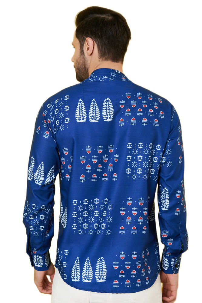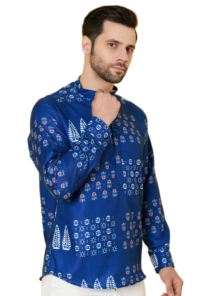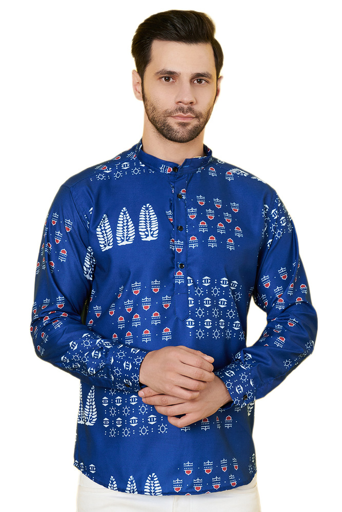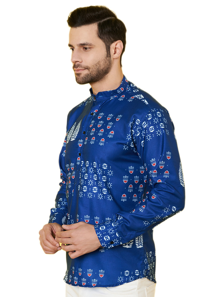 Blue Poly Cotton Printed Self Design Long Sleeve Short Kurta Type Shirt