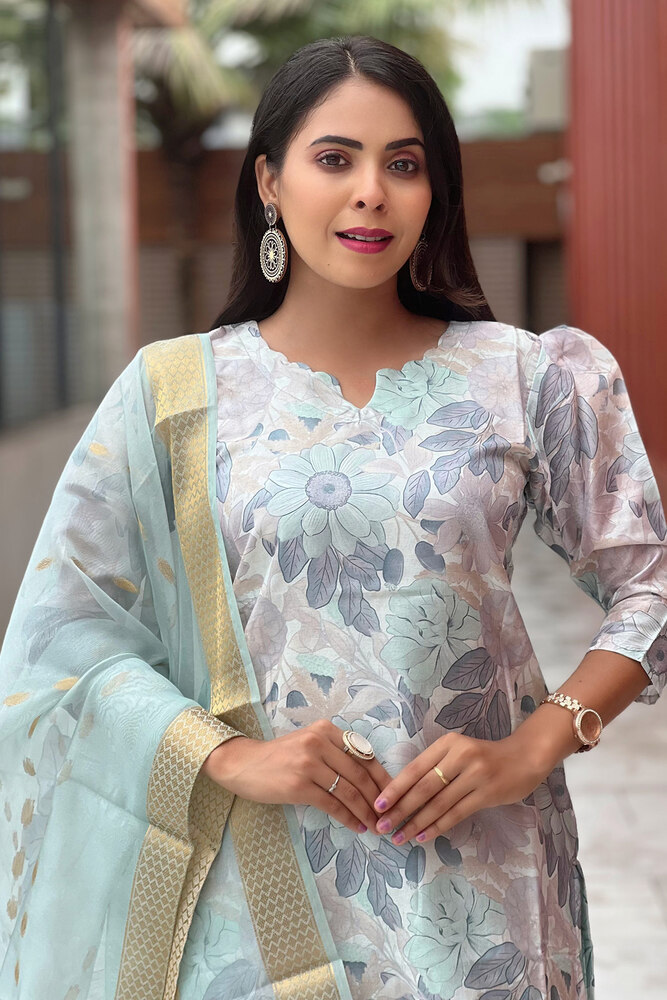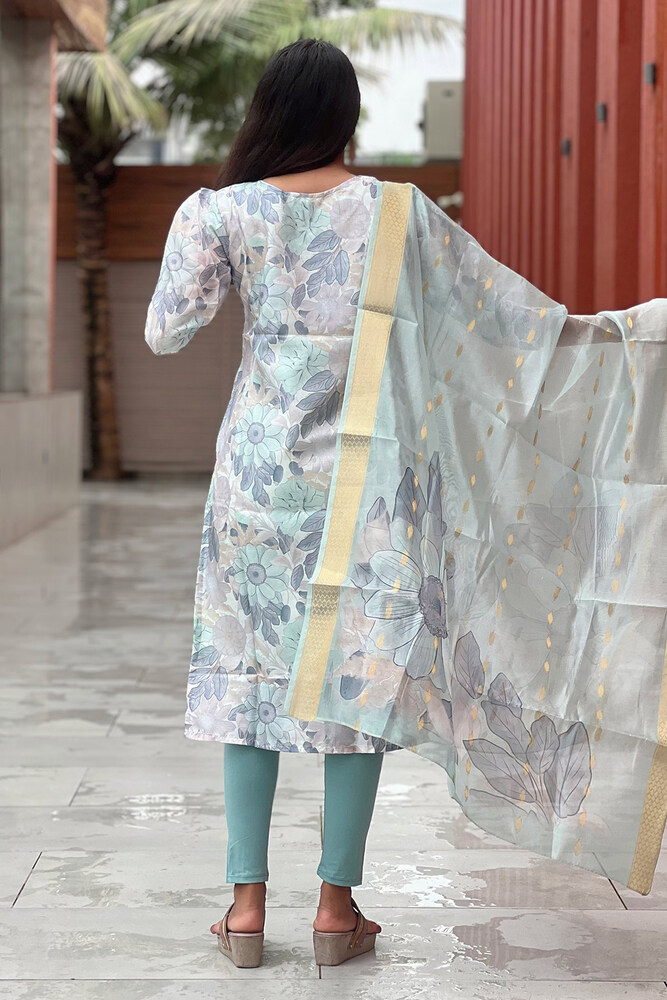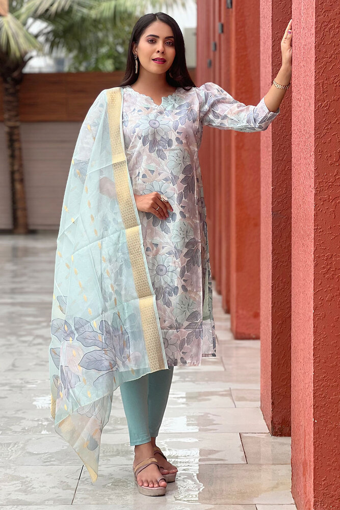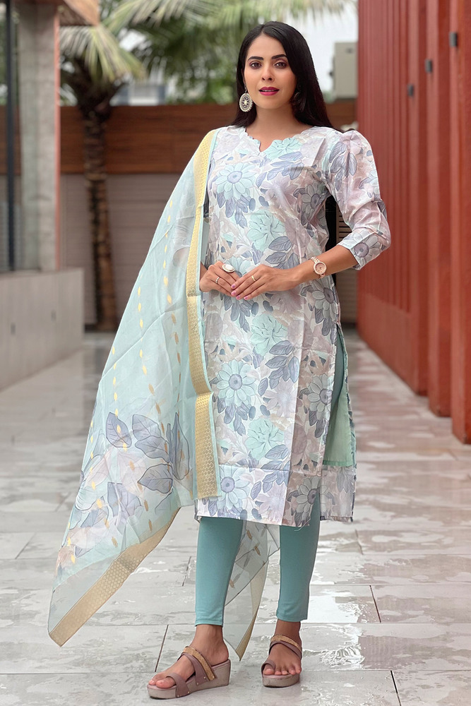 Bosaru Womens Floral Print Cotton Kurta Set with Dupatta, White and Mint Green, Casual Wear,No Bottomwear, Only for Kurti and Bottom