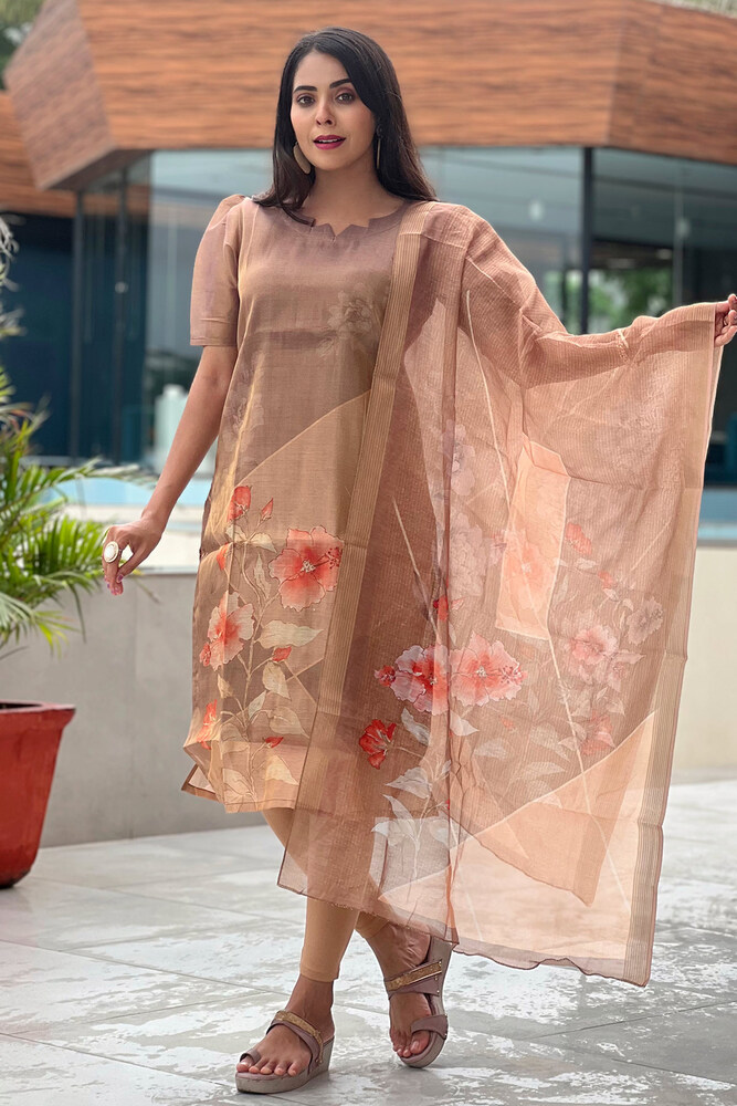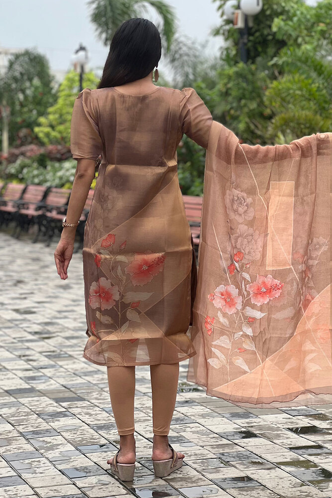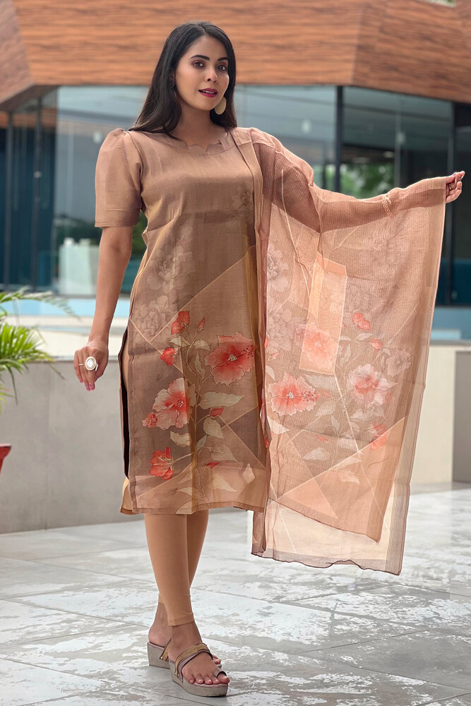 Product HighlightsBosaru Designer Ethnic Kurti with Floral Dupatta Set, Beige and Coral, 3/4 Sleeve, No Bottomwear, Only Kurti and Dupatta