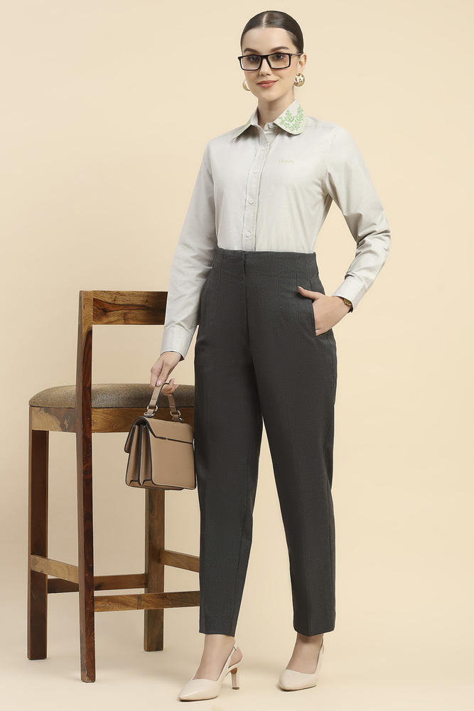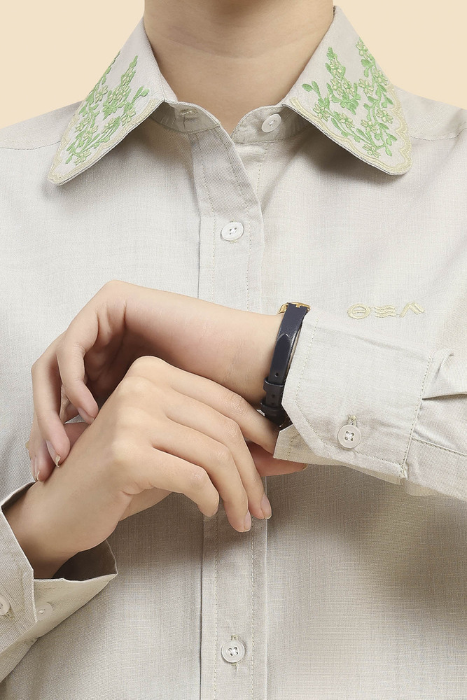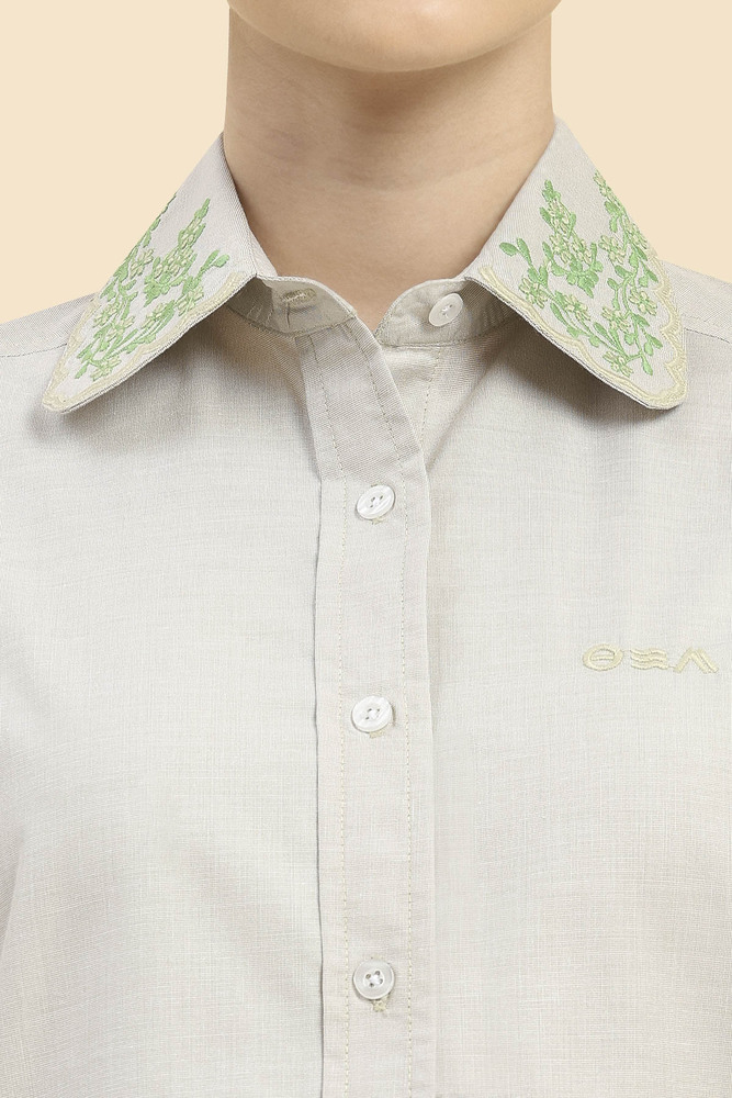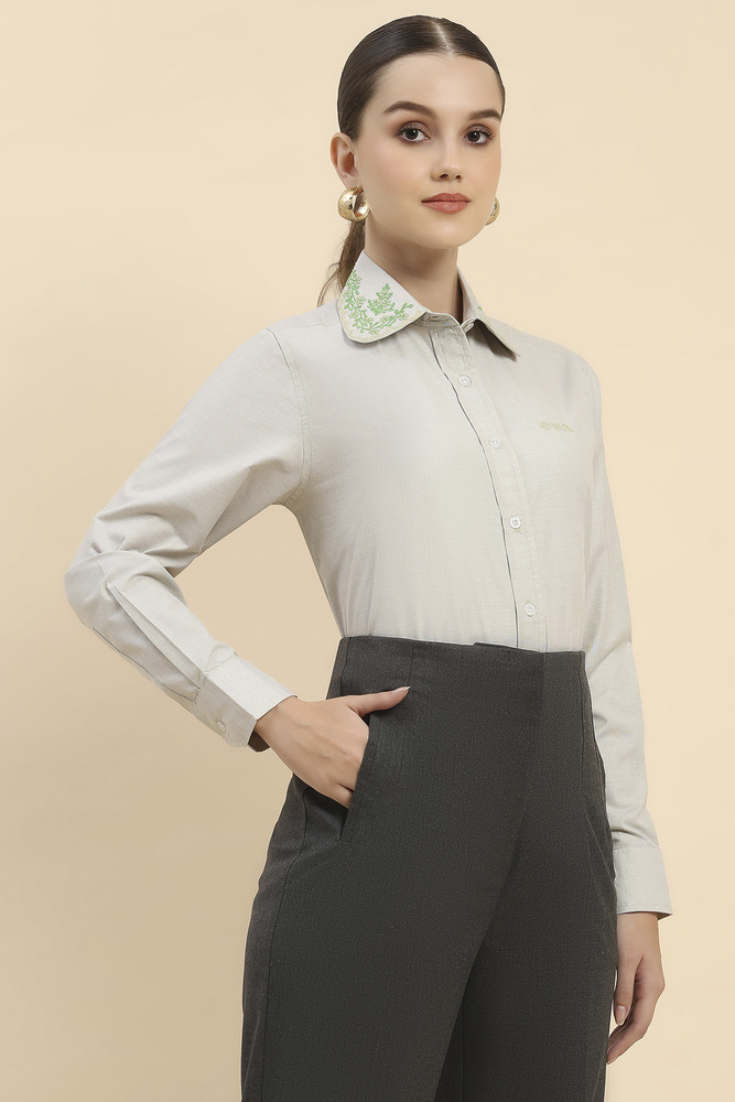 Enjoy flexible comfort with this beige solid shirt for women designed in cotton lycra fabric. The stretchable fit ensures ease of movement and polished daily styling. Model height is 5.7 feet and wearing S size. Disclaimer Please note that the color of the product shown on the website may differ slightly from the actual product due to factors such as lighting and screen display.