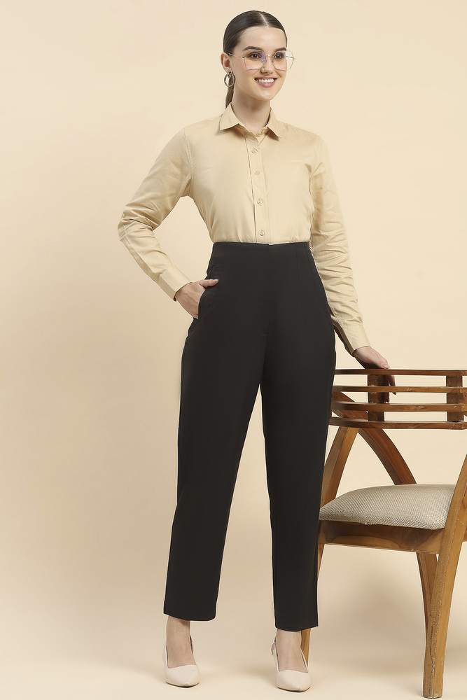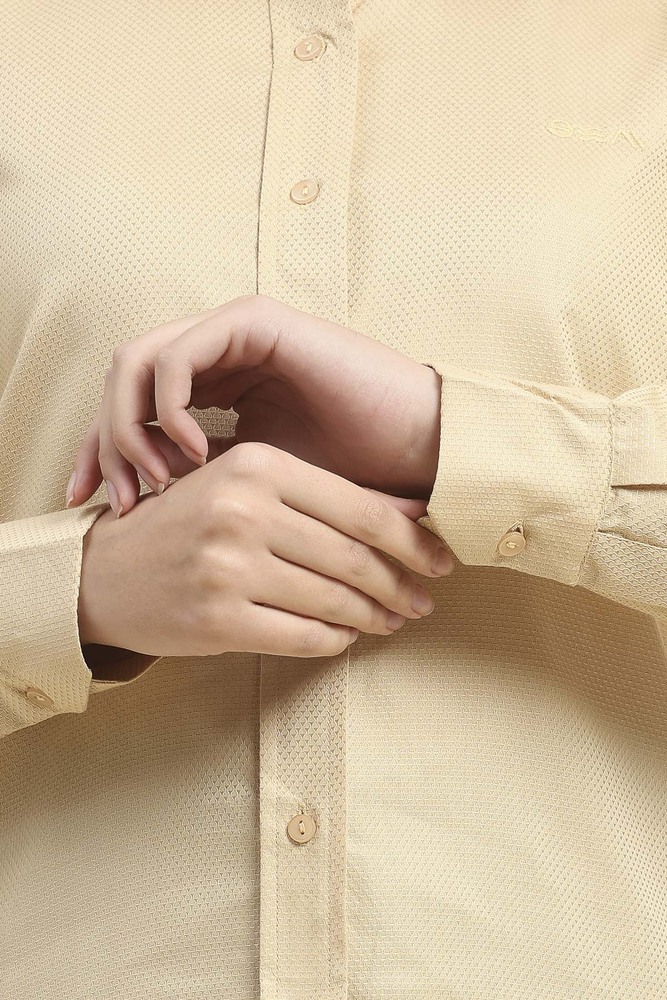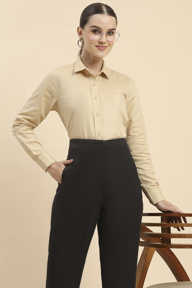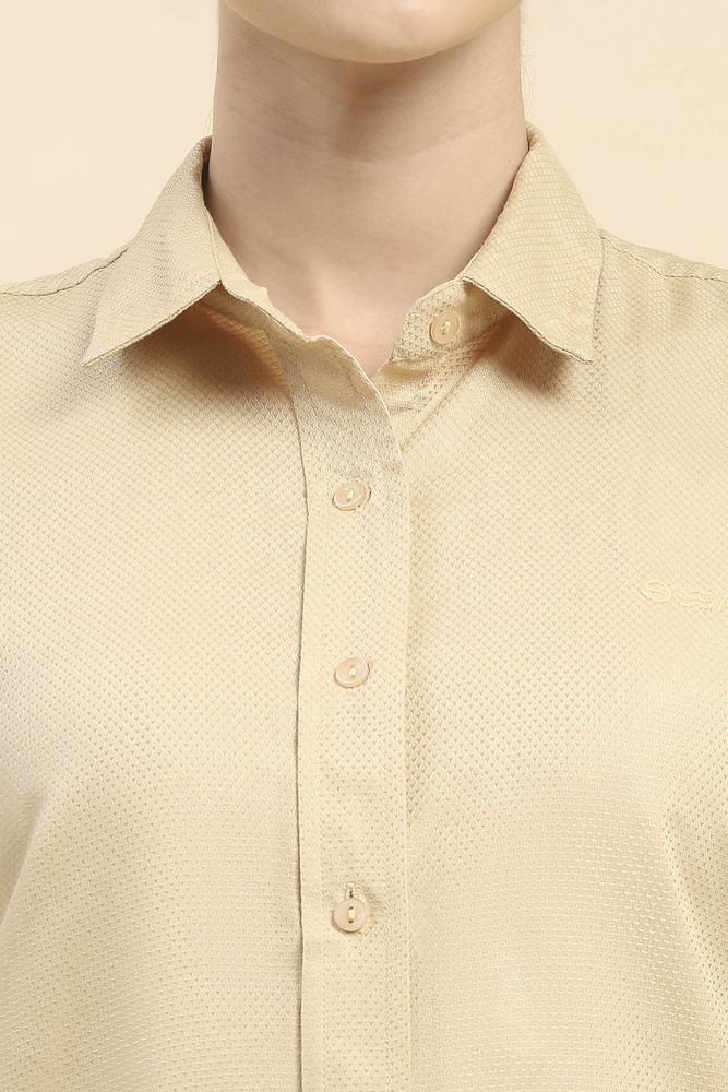 Keep your style simple and elegant with this beige solid shirt for women crafted from lightweight cotton fabric. The comfortable fit makes it perfect for workwear casual outings and daily use. Model height is 5.7 feet and wearing S size. Disclaimer Please note that the color of the product shown on the website may differ slightly from the actual product due to factors such as lighting and screen display.