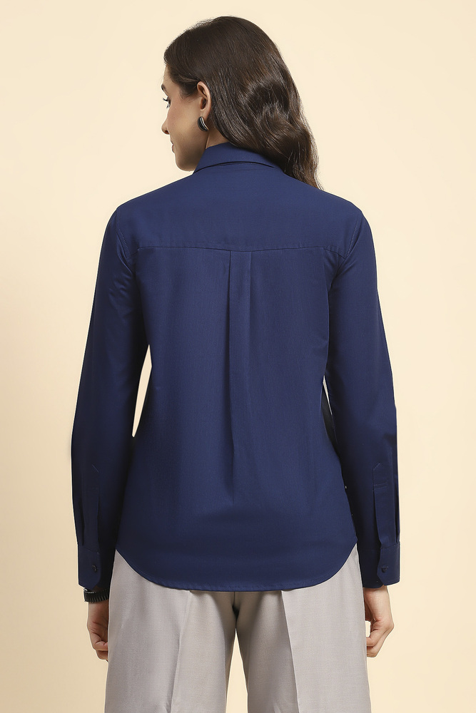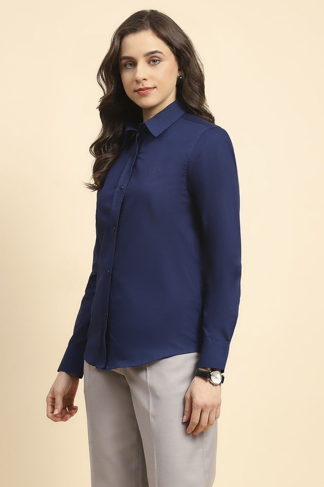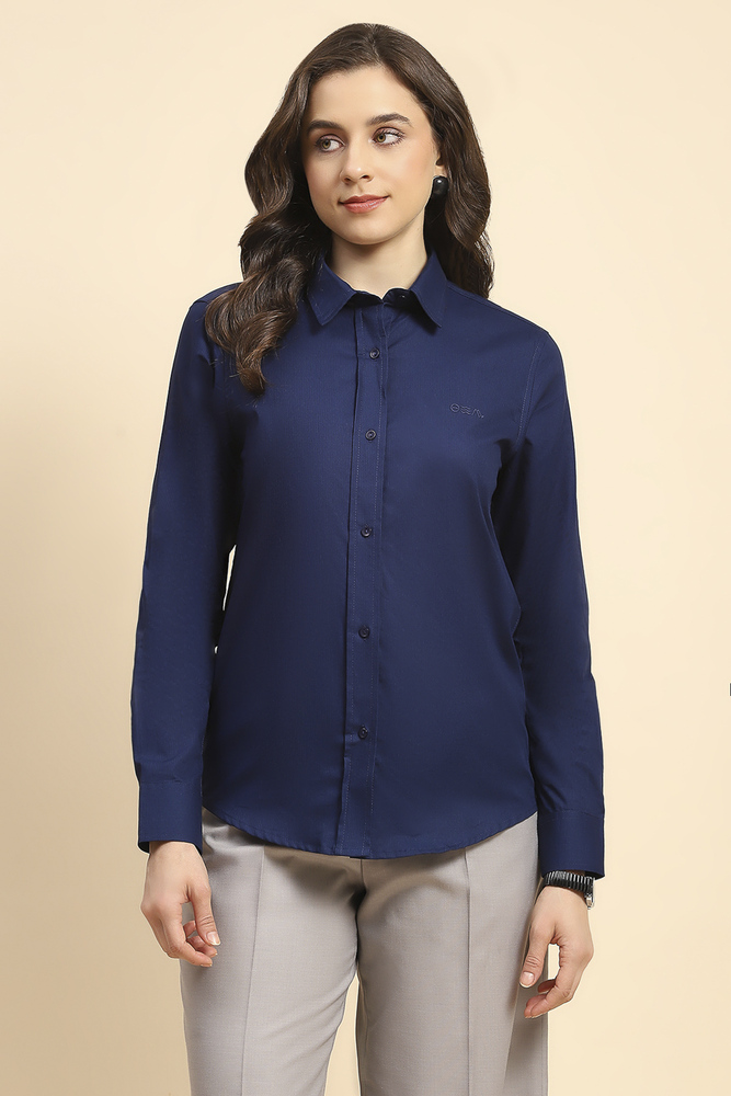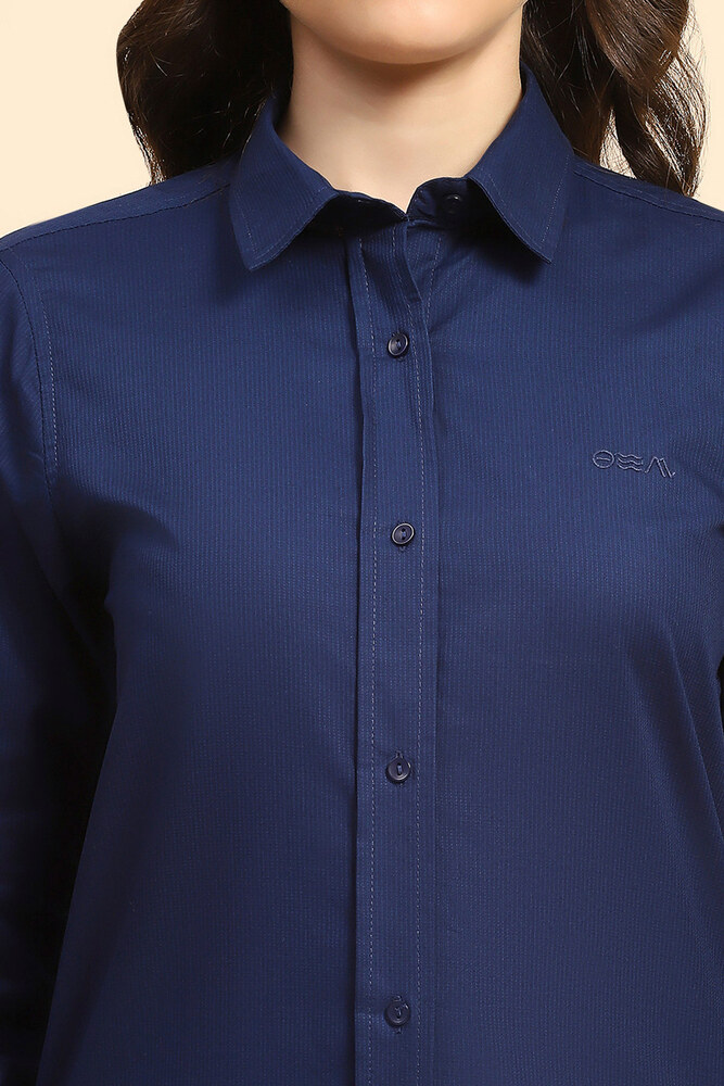 Crafted from a premium Cotton, this shirt offers the natural breathability of cotton, ensuring an exceptionally comfortable and flexible fit that moves with you. The timeless solid navy blue color makes it a versatile staple for any wardrobe, suitable for a myriad of occasions. A subtle textured weave adds a touch of understated elegance, and a small embroidered logo provides a hint of branding. Ideal for both formal office environments and smart casual events, this women shirt is a true workwear hero. Pair it with tailored trousers or a skirt for a polished professional look, or dress it down with jeans for a chic yet relaxed ensemble. Experience effortless style and all day comfort. Model height is 5.8 feet and wearing S size. Disclaimer - Please note that the color of the product shown on the website may differ slightly from the actual product due to factors such as lighting and screen display.