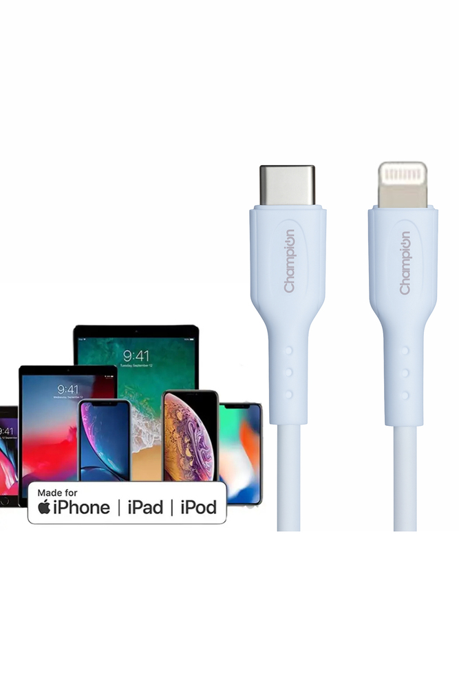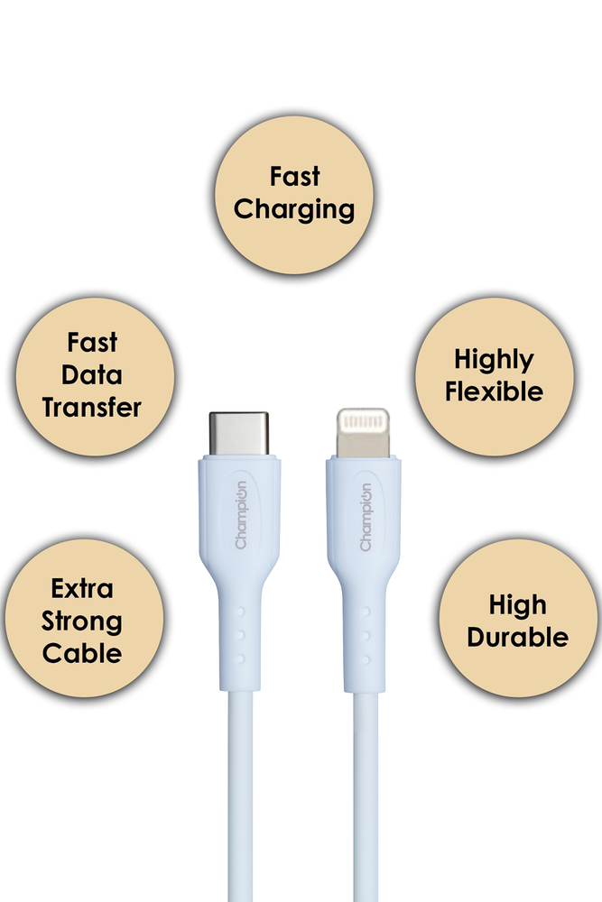 Experience next level charging and syncing performance with the Champion Type C to iPhone PD 27W Fast Charging Cable. Designed to deliver super fast Power Delivery (PD) charging and seamless data transfer, this cable is a must have accessory for all Apple device users. Key Features: Power Delivery (PD) 27W Fast ChargingCharge your iPhone up to 3X faster than conventional chargers. Universal CompatibilityWorks flawlessly with all Apple devices with a Lightning port including iPhone 15/14/13/12/11/XS/X/8 series, iPads, and more. Durable PVC BuildCrafted with premium grade PVC material that resists wear and tear, providing long lasting durability and flexibility.. High Speed Data SyncTransfer files, photos, and videos at lightning fast speeds with 480 Mbps data transfer rate. Reversible Type C ConnectorFeatures a Type C input, allowing compatibility with modern power adapters, laptops, power banks, and car chargers. Safe And ReliableIntegrated with smart chip protection to safeguard against overcharging, overheating, and short circuiting. Tangle Free DesignSmooth PVC coating keeps the cable tangle free and easy to store or carry in your bag or pocket. Perfect Length for Daily UseIdeal for charging at home, in the office, or while traveling offering convenient reach without clutter.Upgrade your charging experience with the Champion Type C to iPhone PD 27W Cable the perfect blend of speed, safety, and durability!
