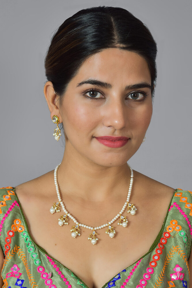 It is a Pearl Beautiful Chokar Necklace Earring Jewelry set, made with Small Green Stone with Kundan, Pearls and Handing Beads Stones work. Gold Tone Small Beads and handmade with Pearls and Kundan. Golden Brass Used in this product. All product from SIONA skin friendly and lightweight as well adjustable sizes.