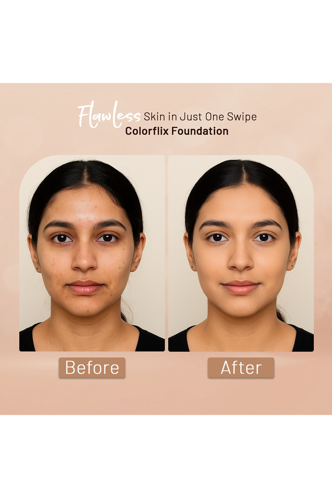 Discover the secret to a flawless, long lasting matte finish with ColorFlix HD Matte Foundation in Caramel Glow. This 30ml bottle is packed with the power to transform your complexion, providing high coverage that effectively conceals blemishes, dark spots, and uneven skin tone. Designed with the Indian climate in mind, our oil control formula keeps shine at bay, ensuring your makeup stays fresh and matte throughout the day, even in humid conditions. Experience the comfort of a lightweight foundation that feels like second skin. Its breathable texture allows for all day wear without clogging pores or feeling heavy. ColorFlix HD Matte Foundation is waterproof, providing peace of mind that your makeup will stay put, whether you're facing a busy day or attending a special occasion. The Caramel Glow shade is carefully crafted to complement a variety of Indian skin tones, delivering a natural, radiant look. Suitable for all skin types, including sensitive skin, this foundation creates a smooth and even canvas for your makeup, enhancing your natural beauty. Get ready to experience the confidence of a flawless complexion with ColorFlix HD Matte Foundation. Its long stay formula means fewer touch ups, giving you more time to enjoy your day.