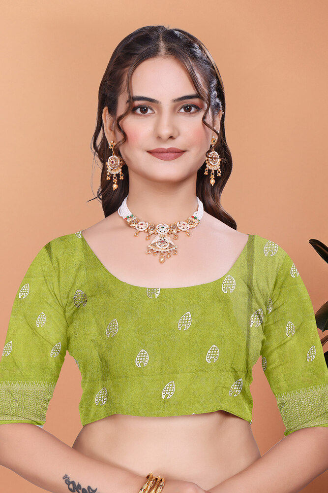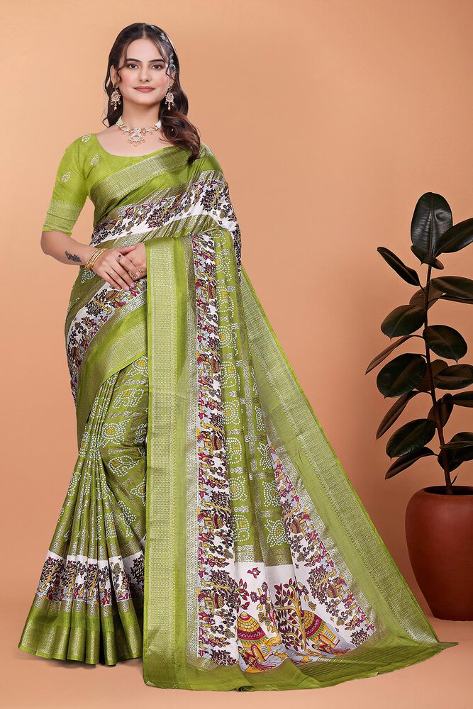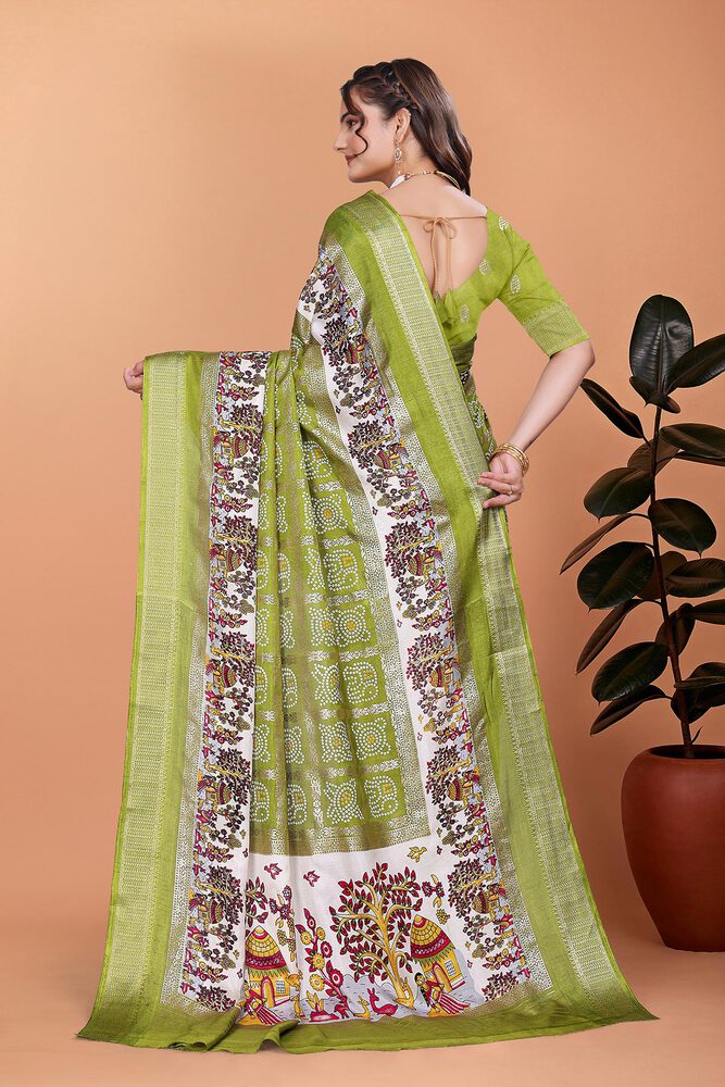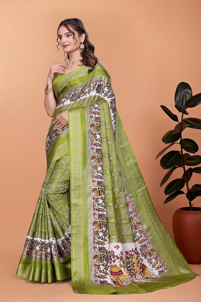 Dola Silk Bandhani Print With Foil Print And Designer Concept Blouse Piece - Mahendi