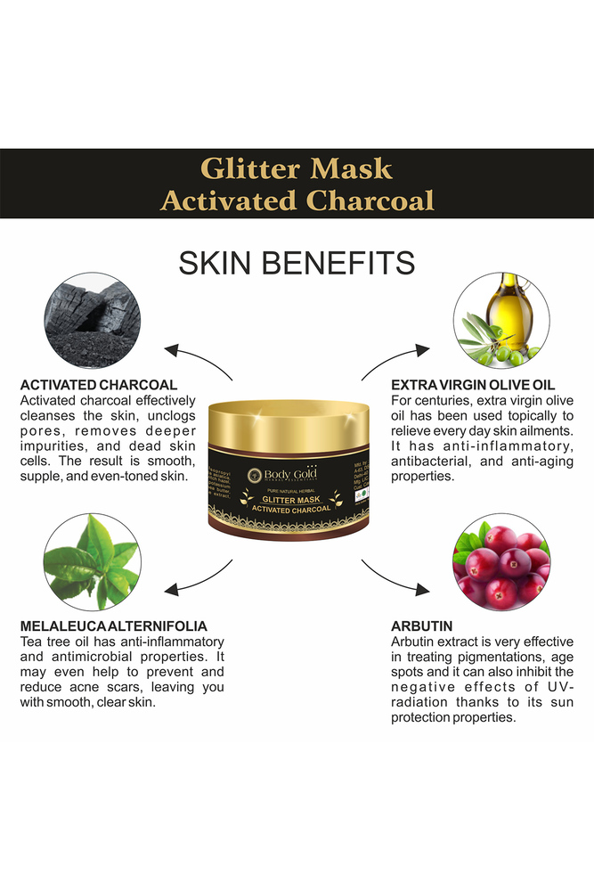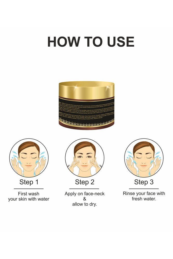 Glitter mask activated charcoal peel off is an advanced, premium antipollution facemask enriched with the goodness of activated charcoal powder, liquorice extract and alteromonas ferment extract, which helps you fight off pollutants that can potentially harm your skin.