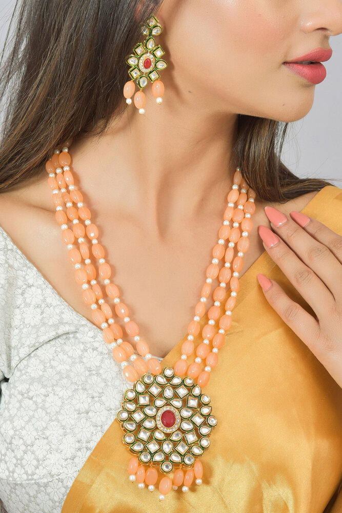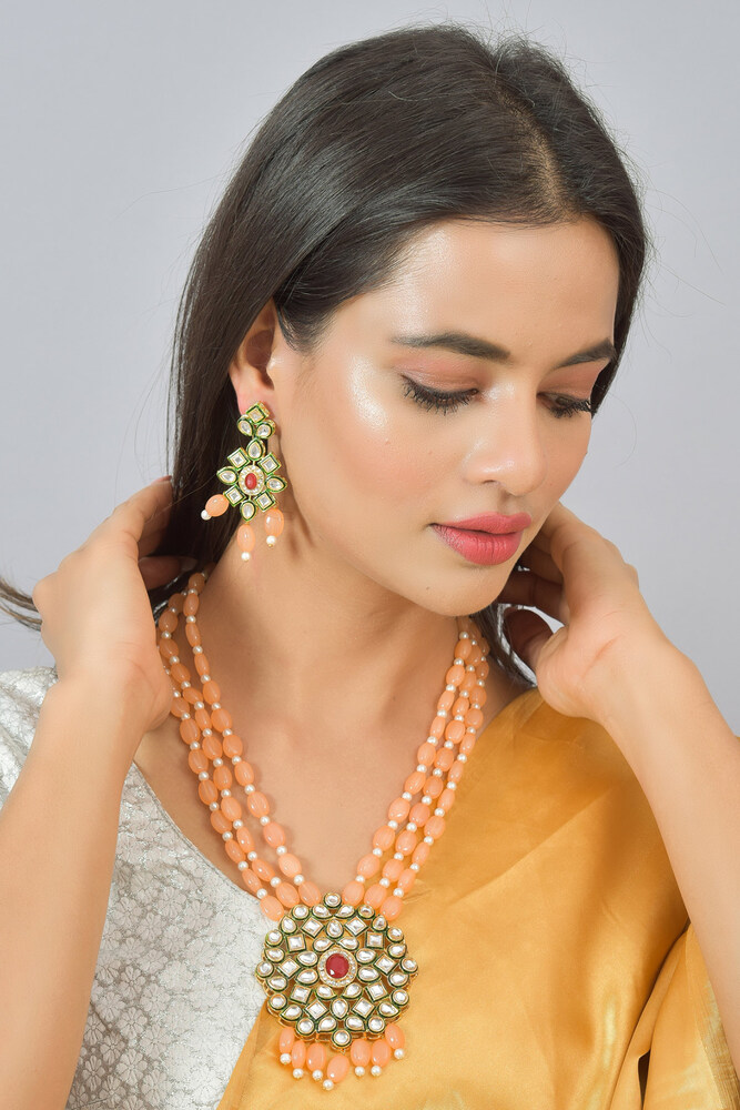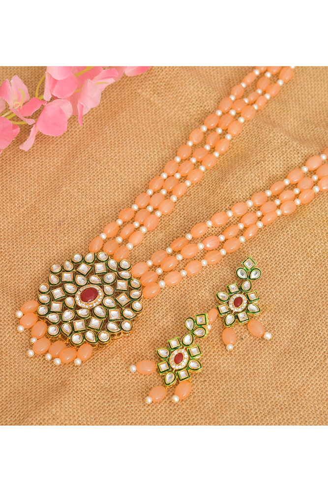 Gold-Plated Kundan Pendant Peach Color Beads And Stone Studded Jewellery Set