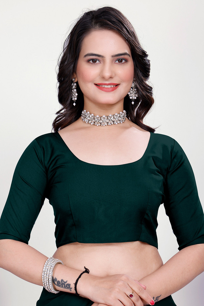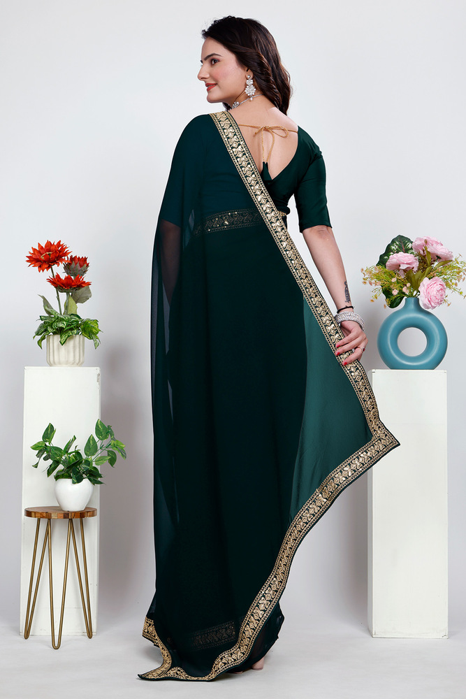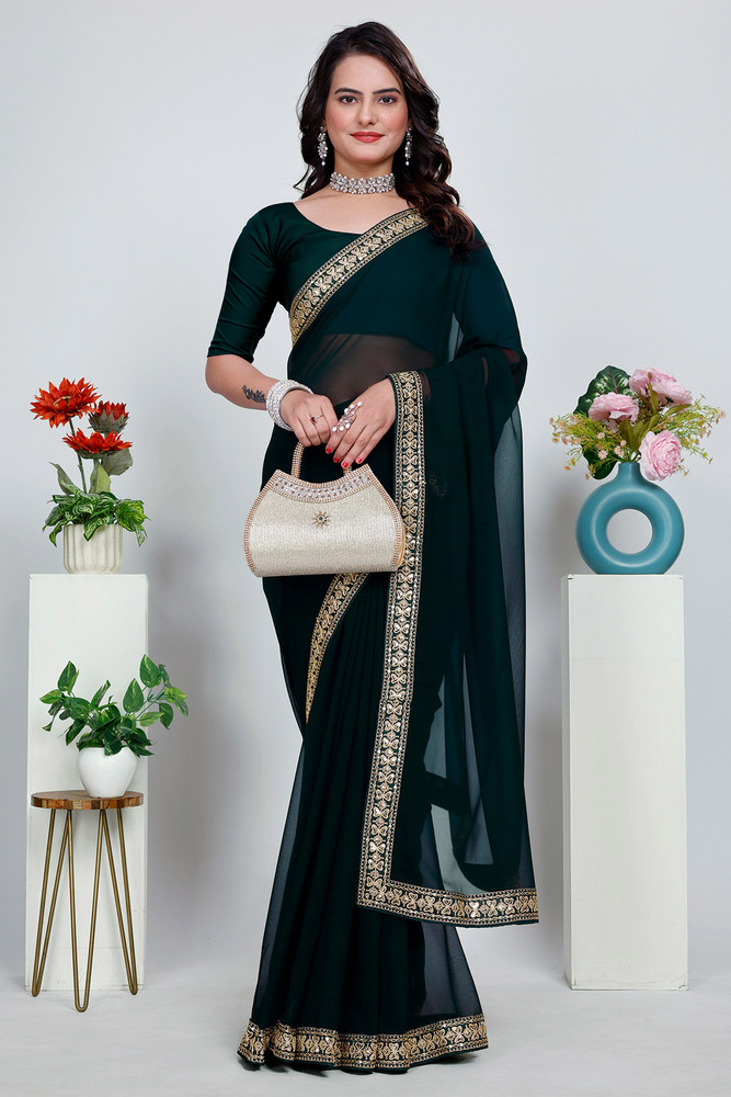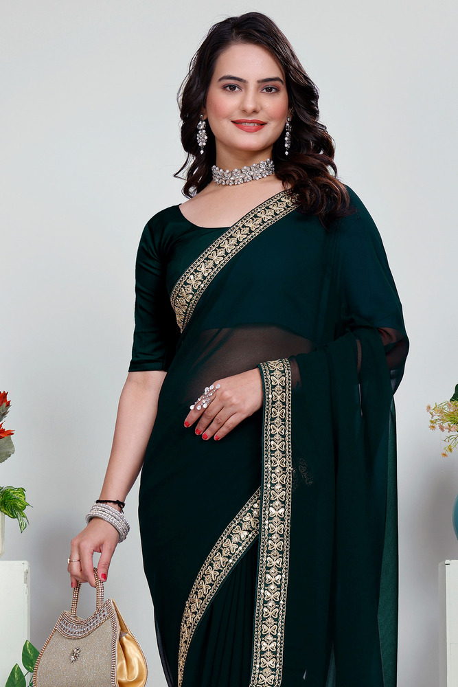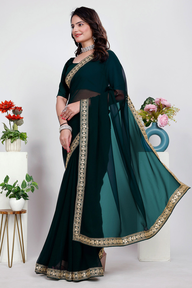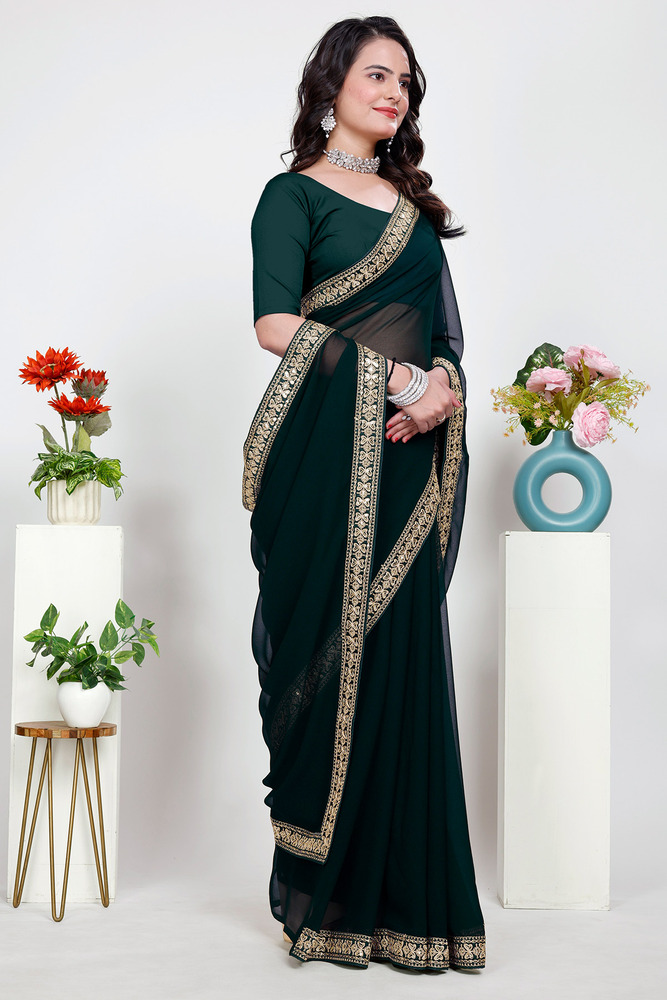 Green Plain Saree With Rich Embroidery Work Lace