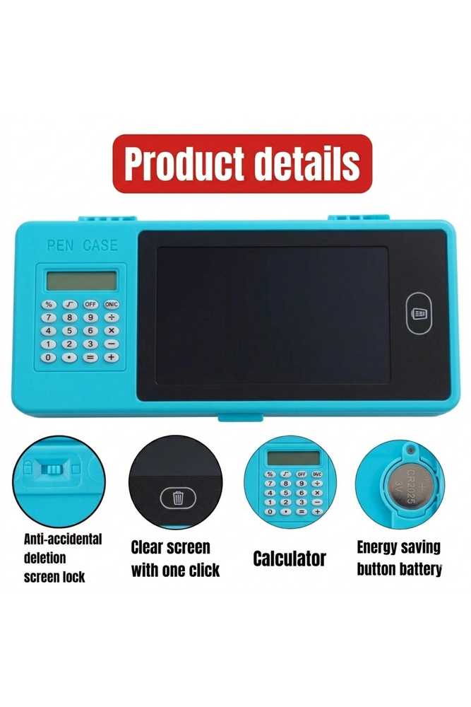 Upgrade your childs stationery collection with the smart and stylish LCD Writing Tablet Pencil Box with Calculator and Fridge Magnet (Blue) – a perfect blend of learning, creativity, and organization. Designed especially for kids, this multifunctional pencil case makes everyday school activities more fun, interactive, and efficient.This innovative pencil box comes with a built-in LCD writing tablet, allowing kids to write, draw, doodle, and practice anytime without using paper. The reusable screen promotes eco-friendly habits and can be erased instantly with a single button, making it ideal for continuous learning and creativity.Equipped with a digital calculator, it helps children perform quick calculations during study time, improving their math skills while keeping everything in one place. The spacious storage compartment is perfect for neatly organizing pencils, pens, erasers, sharpeners, and other stationery essentials.A unique addition is the fridge magnet, which lets kids display their drawings, notes, or reminders on any magnetic surface, encouraging creativity and engagement even beyond study time.Made with durable materials and a vibrant blue color, this pencil box is lightweight, easy to carry, and perfect for everyday use at school, home, or while traveling. It also makes an excellent birthday gift, return gift, or festive present for kids.
