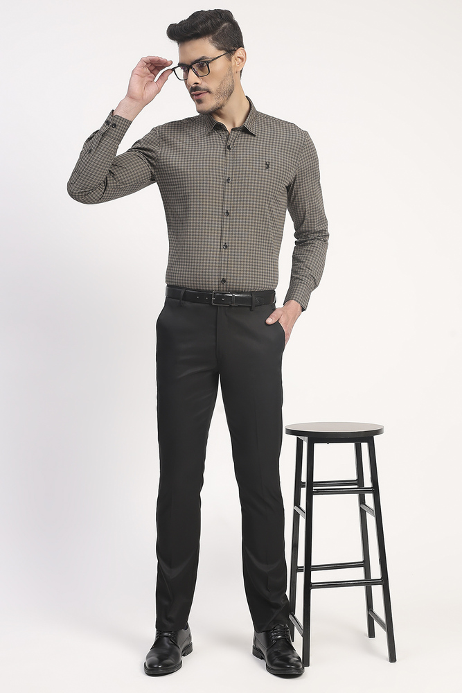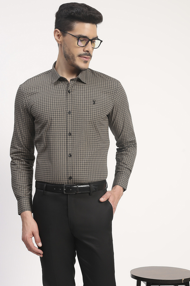 Add a refined touch to your wardrobe with this Ifazone Men Micro Check Shirt in a rich beige and black combination. Made from 100% cotton, it ensures all day comfort and a breathable fit, perfect for workwear or smart casual styling. The detailed micro check pattern offers a timeless appeal, while the full button placket, structured collar, and embroidered chest logo complete the polished look. Pair it with trousers or dark jeans for a confident and effortless ensemble. Model height is 6.2 feet and wearing M size. Disclaimer Please note that the color of the product shown on the website may differ slightly from the actual product due to factors such as lighting and screen display.