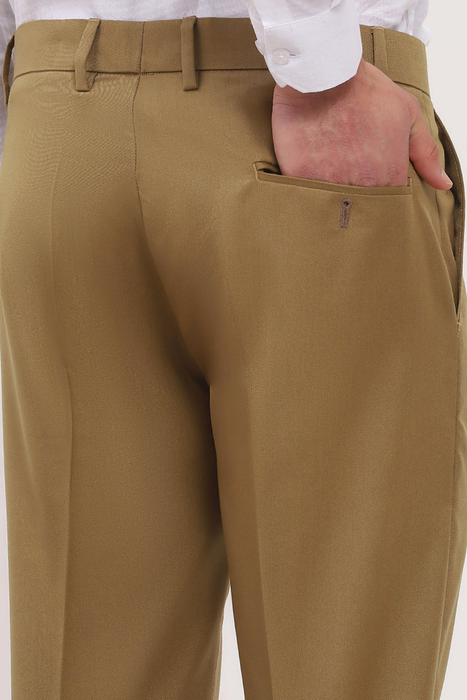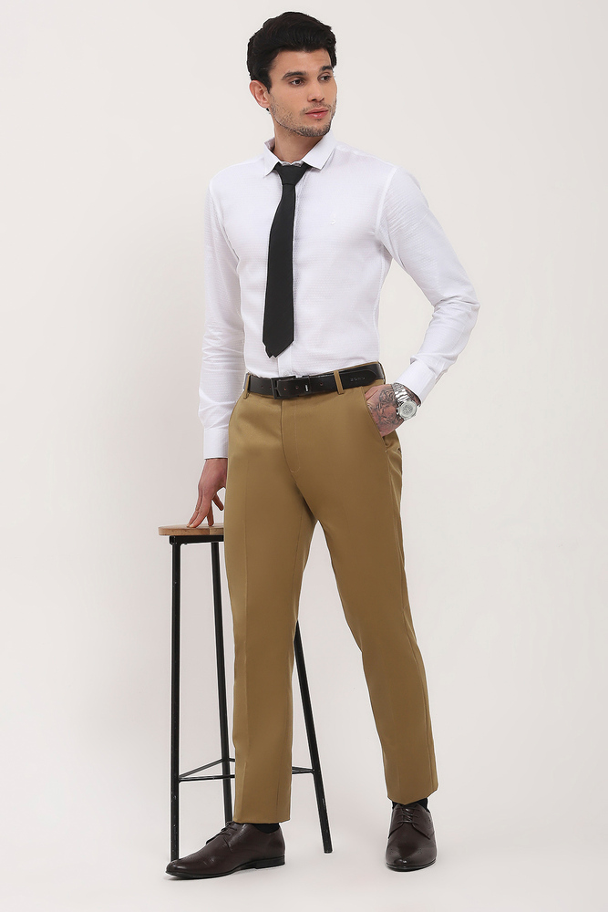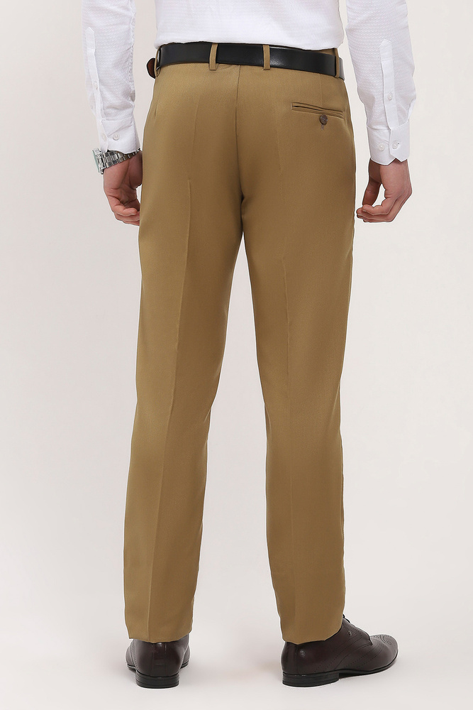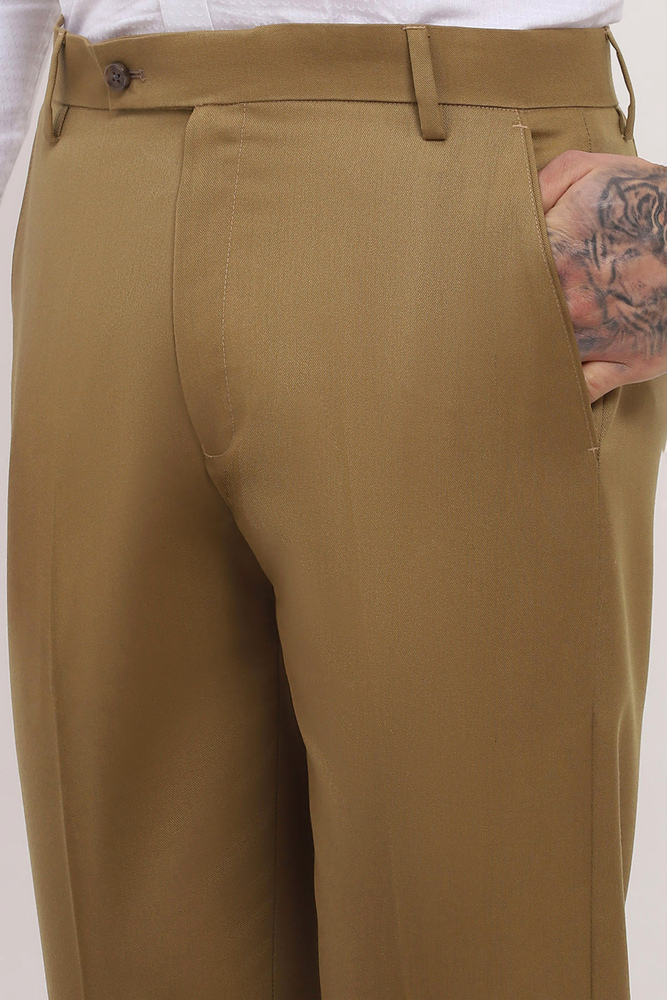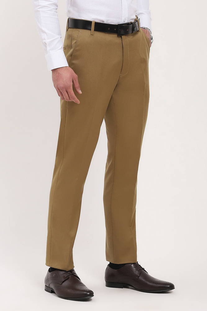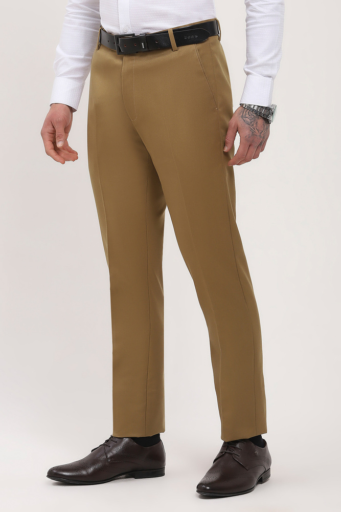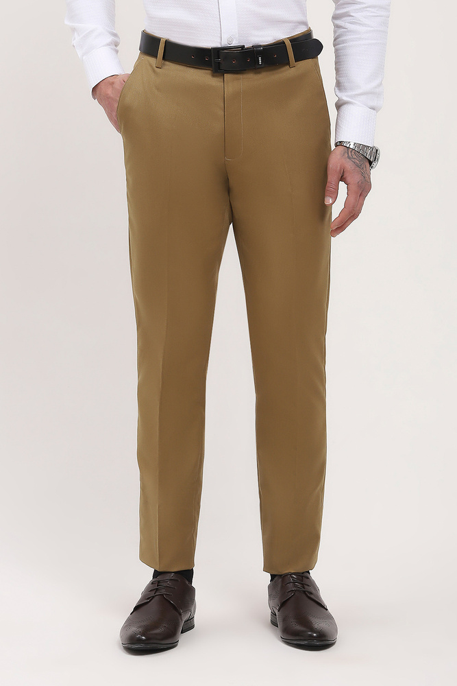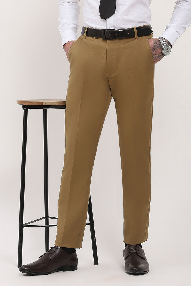 These tan mens trousers are tailored with poly lycra fabric to support comfort and refined styling across long workdays. The clean finish and formal shape make them ideal for office environments conferences and professional events. A versatile option that pairs well with neutral and dark tone shirts and formal footwear. Model height is 6 feet wearing size 32. Disclaimer - Please note that the color of the product shown on the website may differ slightly from the actual product due to factors such as lighting and screen display.
