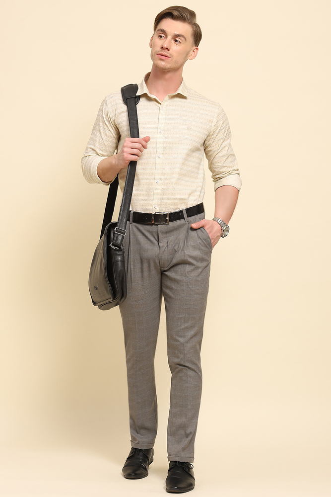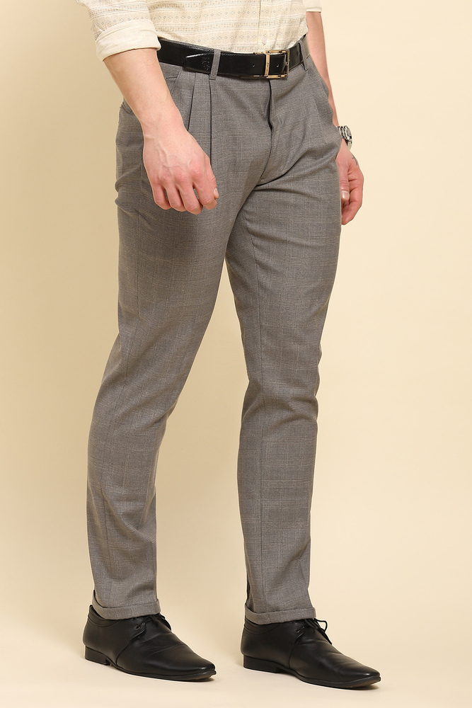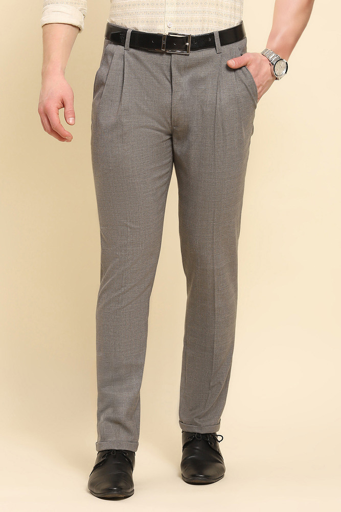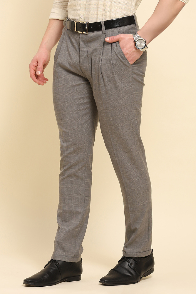 Add a touch of sophistication to your partywear wardrobe with Mr. Huffman Flint Grey Bottom Fold Trousers. Designed with elegance and modern style in mind, these trousers offer a sleek, tailored fit that flatters the silhouette, ensuring you look sharp and refined at any event. The flint grey color provides a versatile, timeless base, making it easy to pair with a variety of shirts and jackets for a polished, put together look. The distinctive bottom fold detail adds a subtle yet stylish touch, giving these trousers a contemporary edge. Crafted from high quality fabric, they provide comfort and a perfect fit, whether you are attending an upscale party, gala, or evening gathering. Model height is 6.1 feet and wearing 32 size. Disclaimer Please note that the color of the product shown on the website may differ slightly from the actual product due to factors such as lighting and screen display.