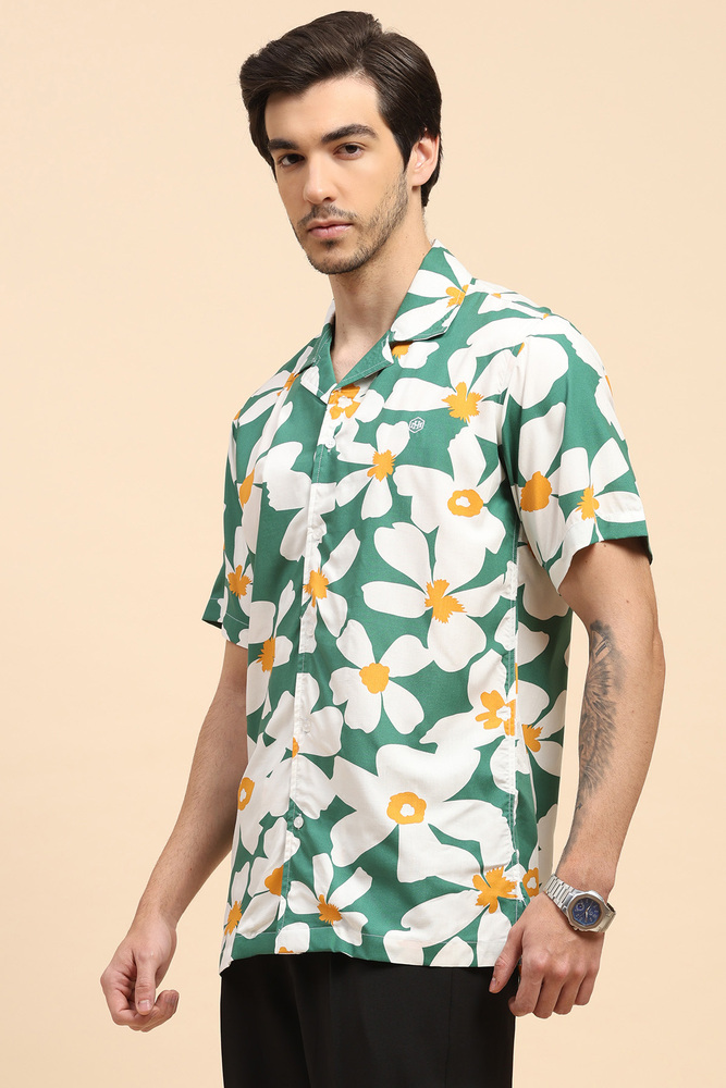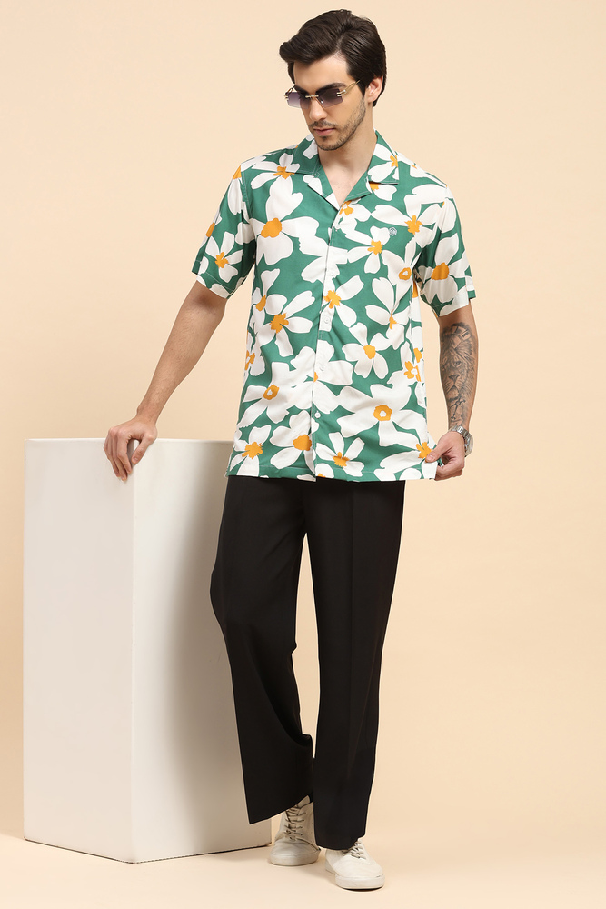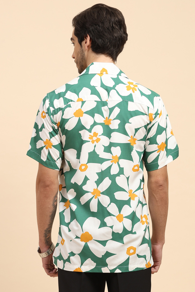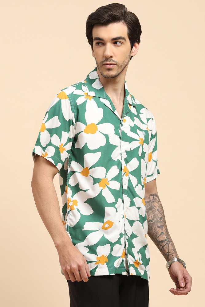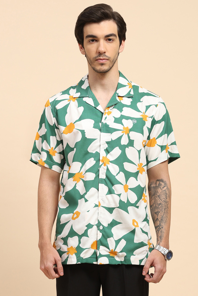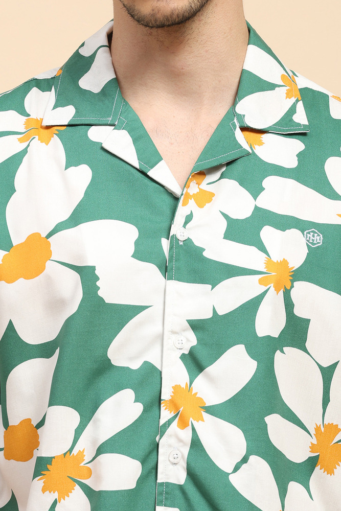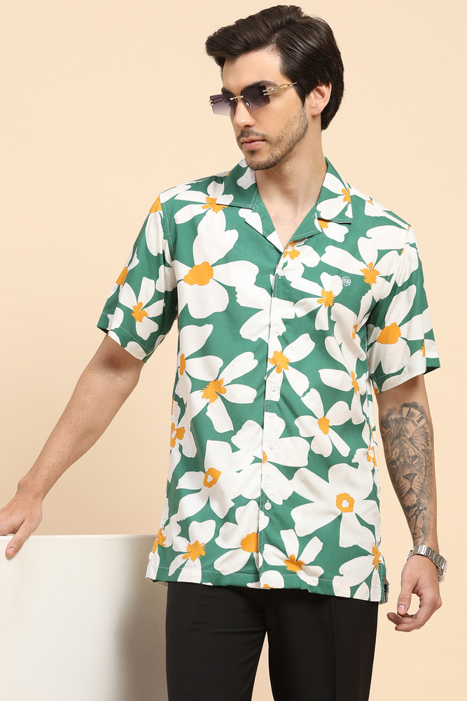 Upgrade your casual style with this Mr. Huffman mens green floral Aloha shirt made from breathable rayon fabric. Featuring a vibrant print and half sleeves, this shirt offers lightweight comfort and a refreshing summer ready appeal. Model height is 6 feet and wearing M size. Disclaimer - Please note that the color of the product shown on the website may differ slightly from the actual product due to factors such as lighting and screen display.