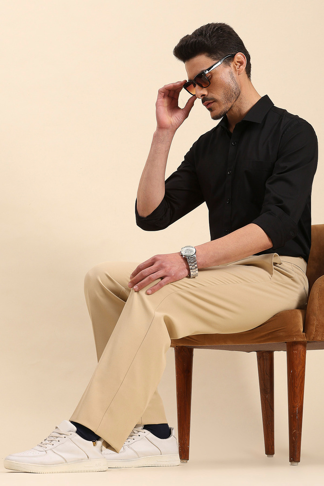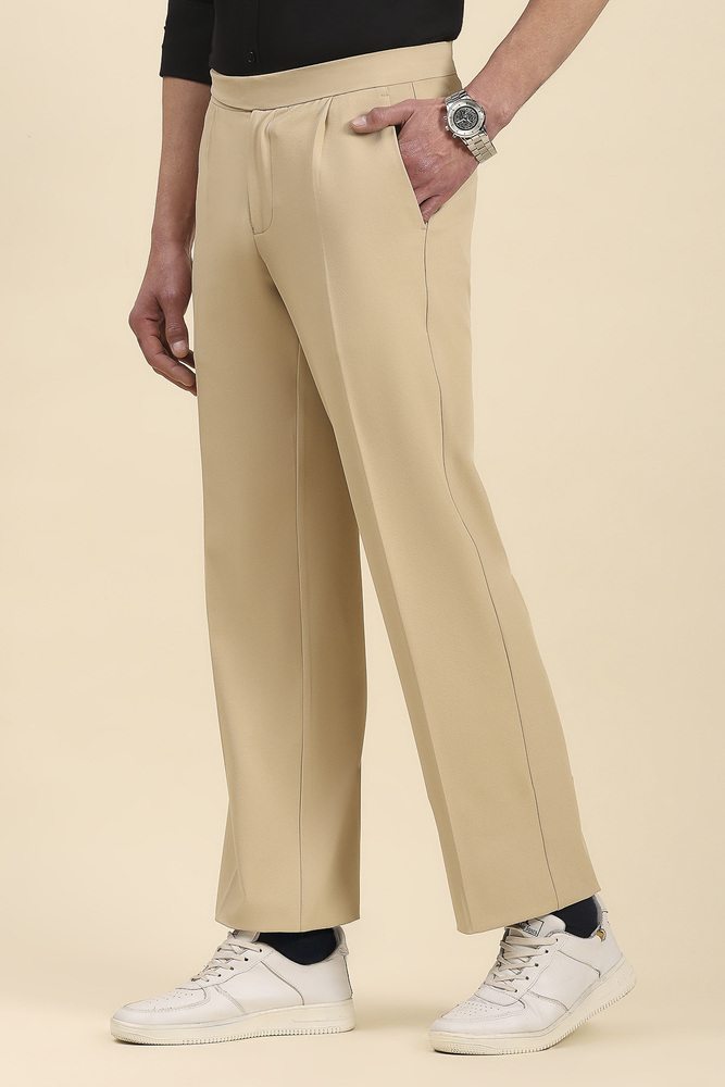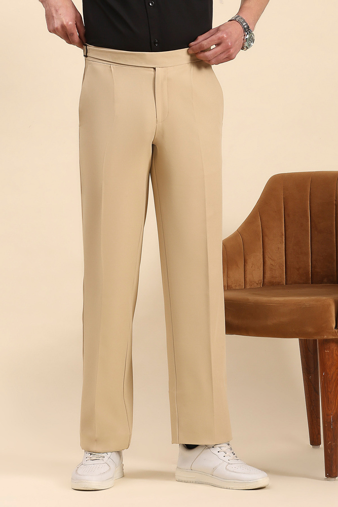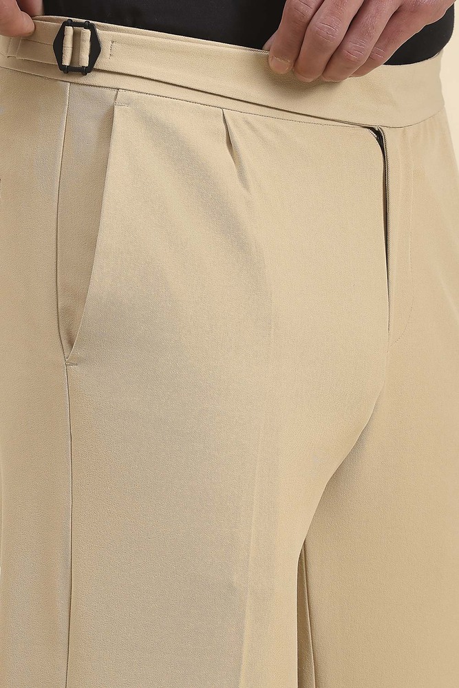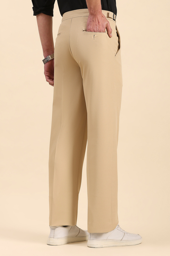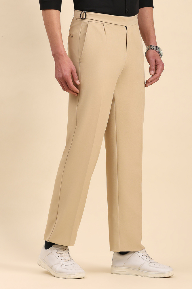 Make a refined statement with the Mr. Huffman Heritage Buckle Premium Gurkha Dark Beige Pant, designed with a signature extended waistband and side buckle fastening. Crafted from premium Poly Lycra stretch fabric, it offers superior comfort, shape retention, and wrinkle resistance for all day wear. The tailored structure enhances your profile while maintaining flexibility, making it ideal for semi formal occasions, office dressing, and smart casual looks. A perfect blend of heritage detailing and contemporary tailoring, this Pant defines timeless menswear elegance. Model height is 6.1 feet and wearing 32 size. Disclaimer - Please note that the color of the product shown on the website may differ slightly from the actual product due to factors such as lighting and screen display.
