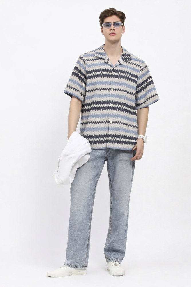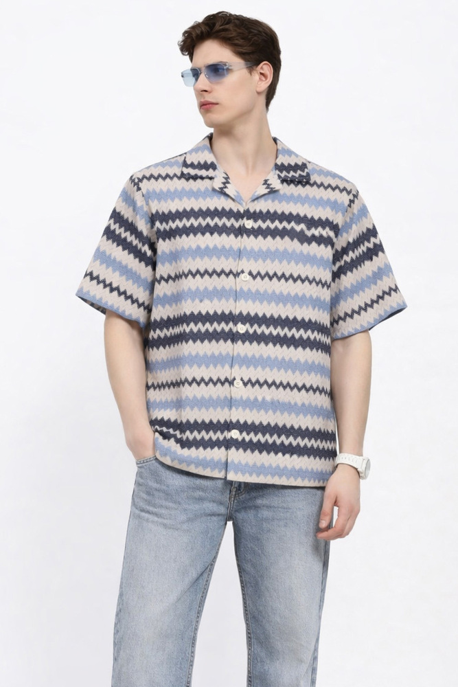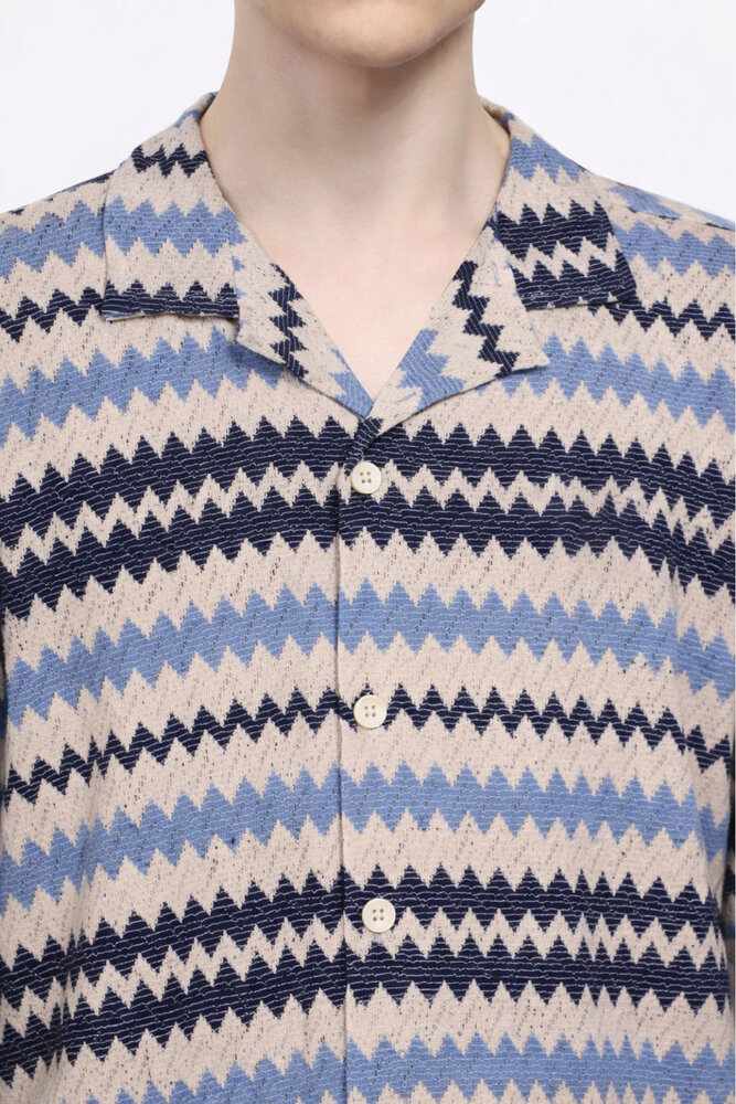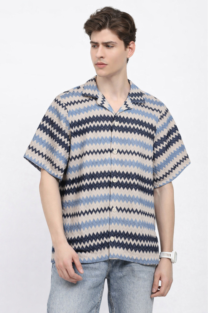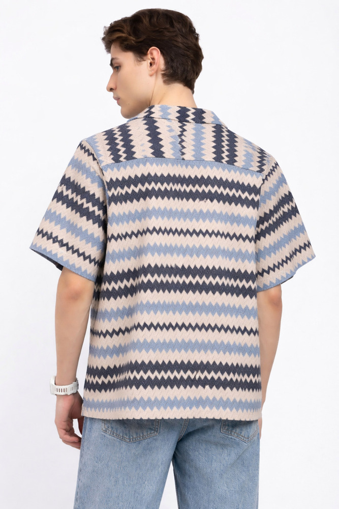 Nowi Men Black and Beige Striped Crochet Knit Cuban Collar Shirt