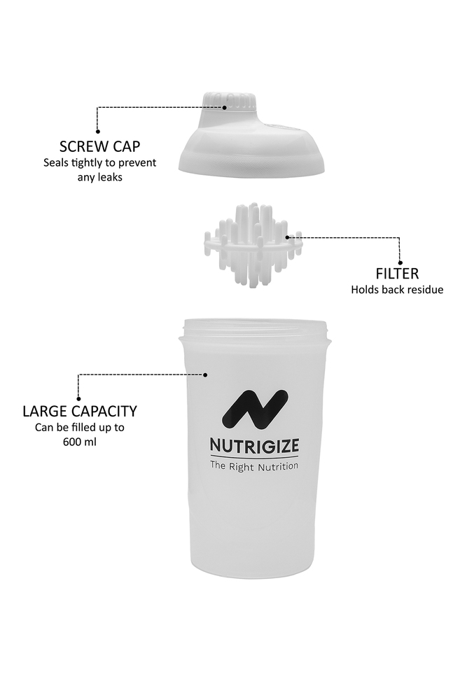 Nutrigize Superior Protein Shaker Bottle with powder storage is a sleek, stylish and functional transparent bottle with a unique design. Comes with a Screw cap which ensures it is 100% leak proof. BPA Free, Safe for dishwasher and freezer