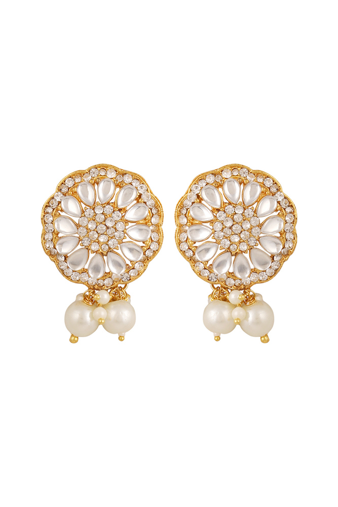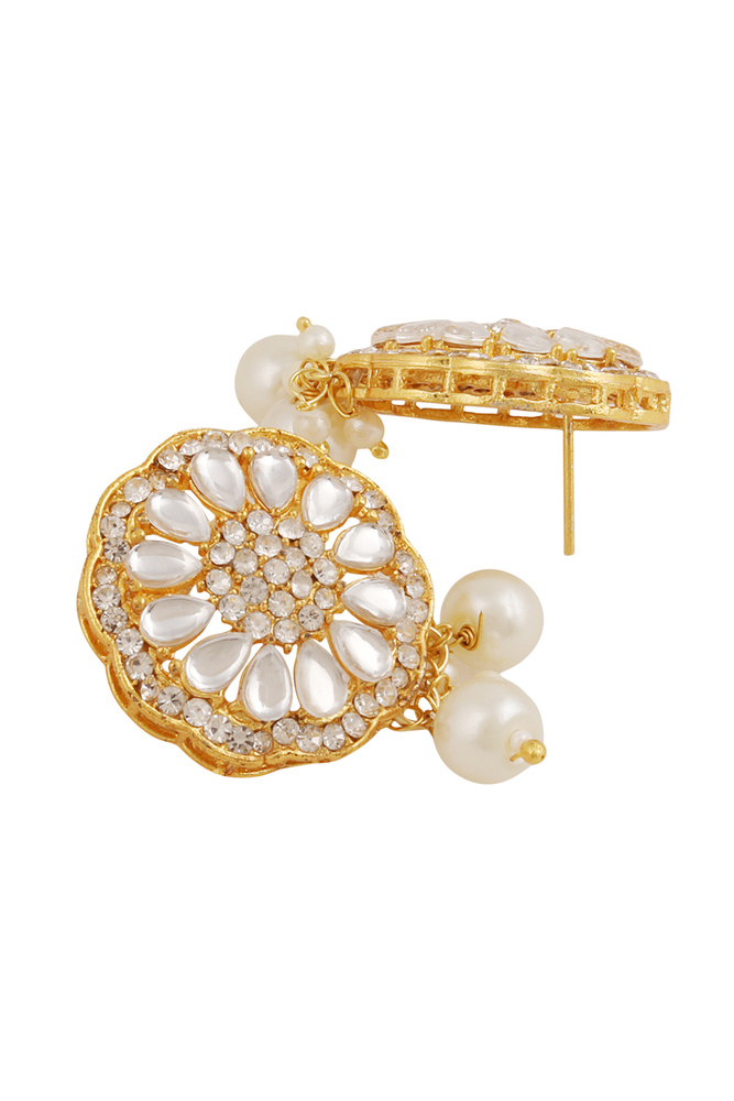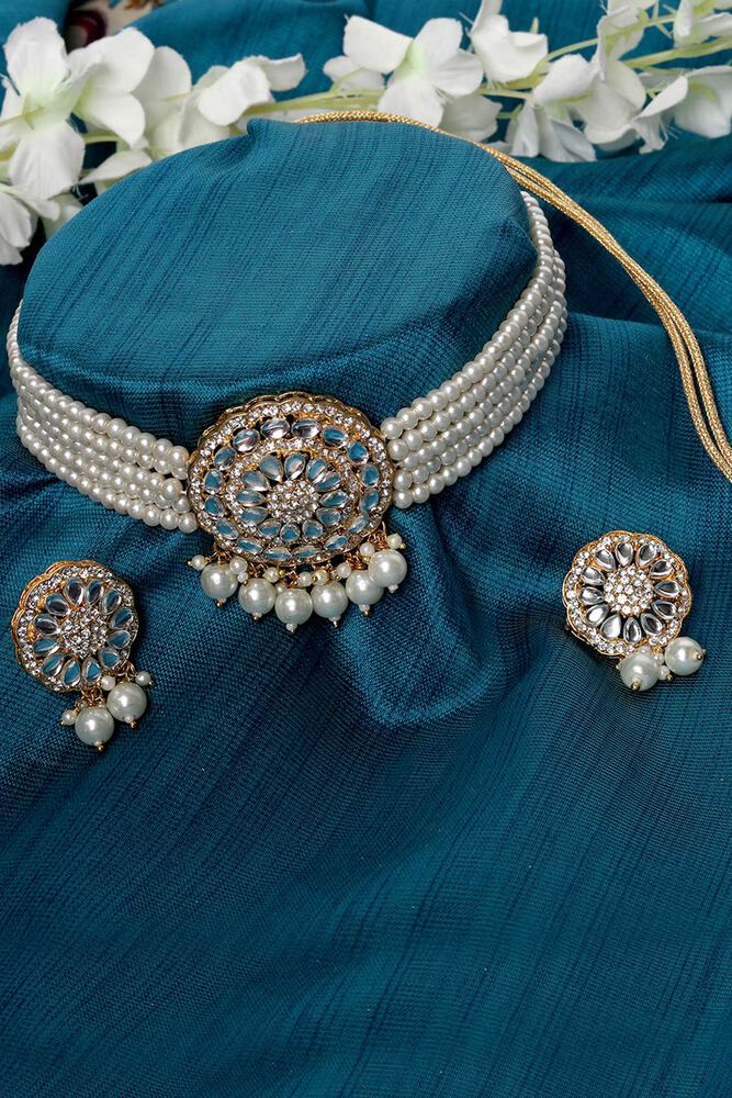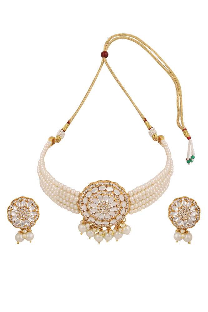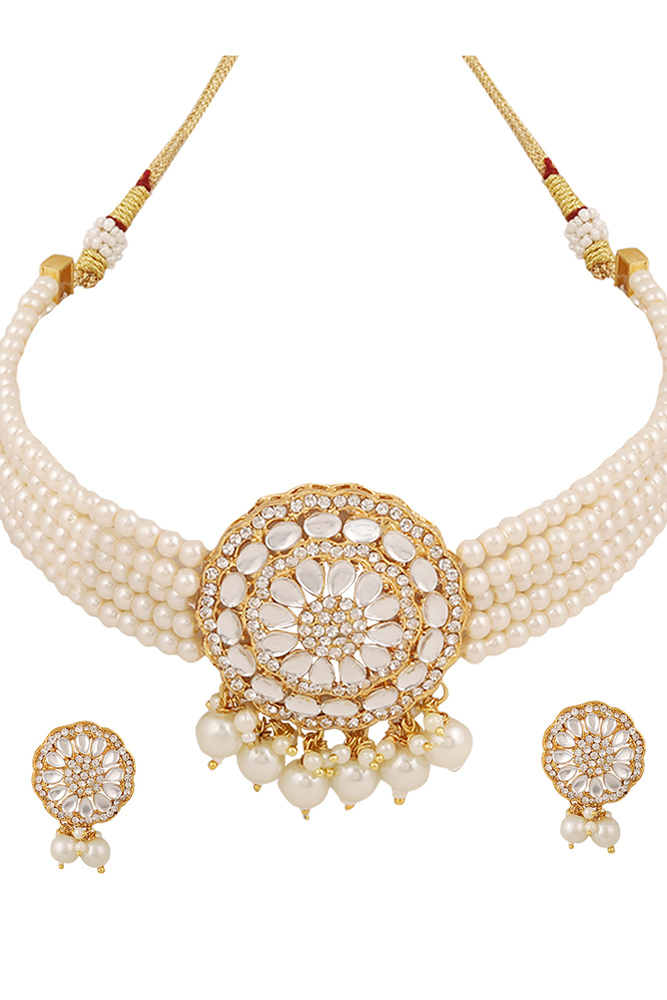 It is a Pearl Chokar Earring set, made with Round pendent and handmade with Pearls and Kundan. Golden Brass Used in this product. All product from SIONA skin friendly and lightweight as well adjustable sizes.