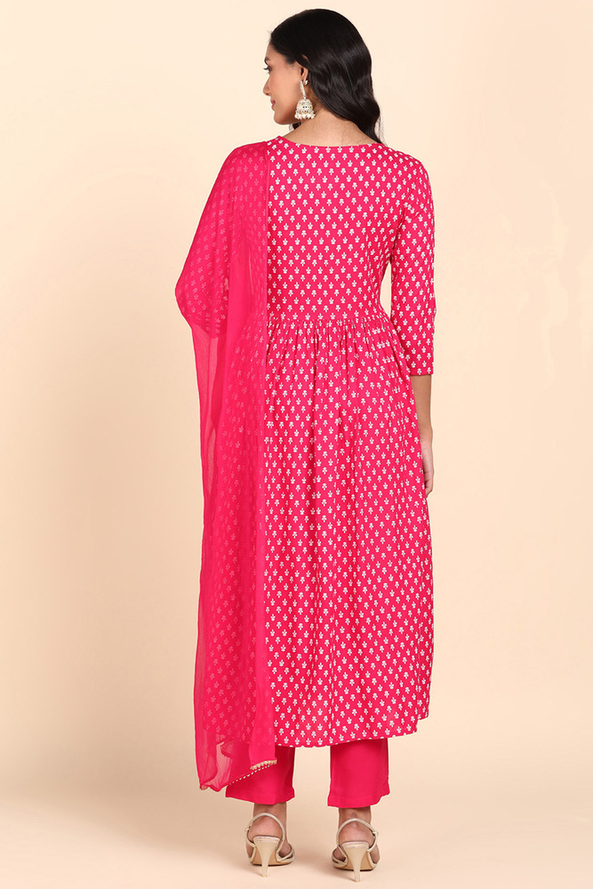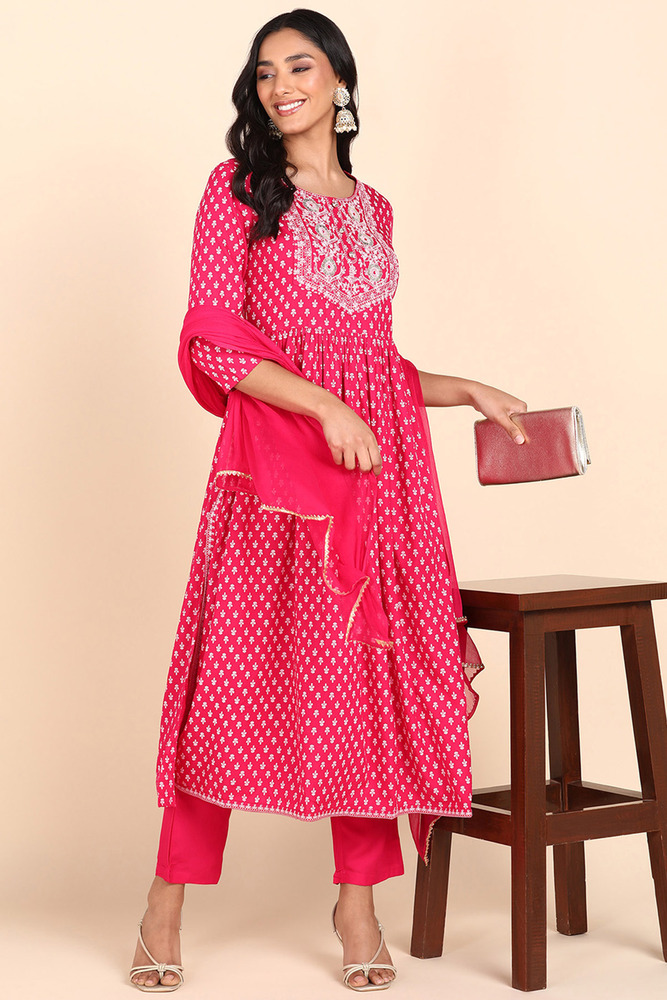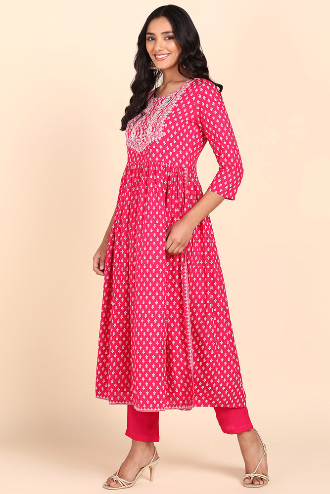 Pink Embroidered Rayon Naira Cut Kurta with Chiffon Dupatta