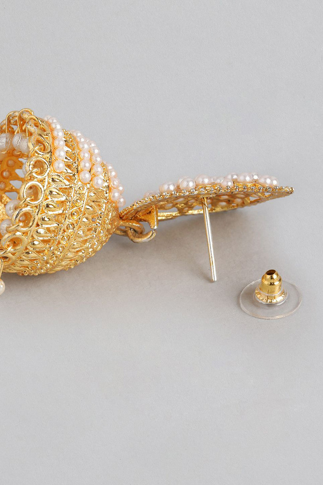 Gold-toned dome shaped jhumkas, gold-plated, has artificial beads Secured with a post and back