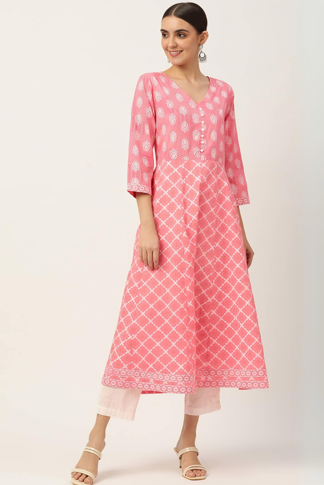 Step into everyday elegance with this pastel pink and white ethnic motif A-line dress. Featuring a flattering V-neck, three-quarter sleeves, and a calf-length flared hem, it is designed for both comfort and charm. The breathable pure cotton fabric and subtle prints make it a go-to choice for casual outings, workdays, or relaxed get-togethers. With its timeless silhouette and soft tones, this dress adds a fresh, graceful vibe to your daily wardrobe.