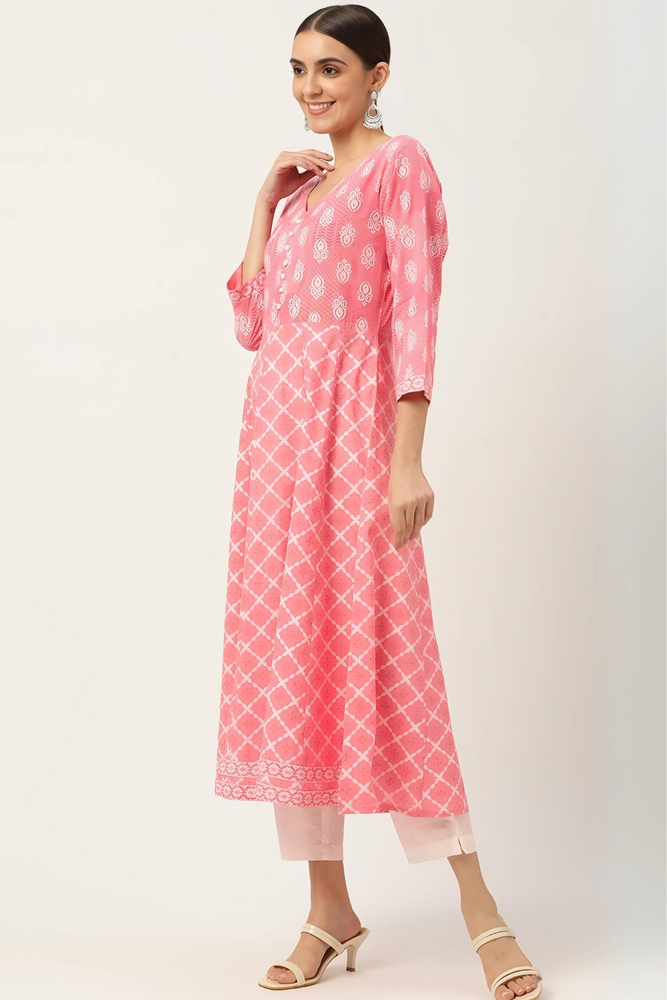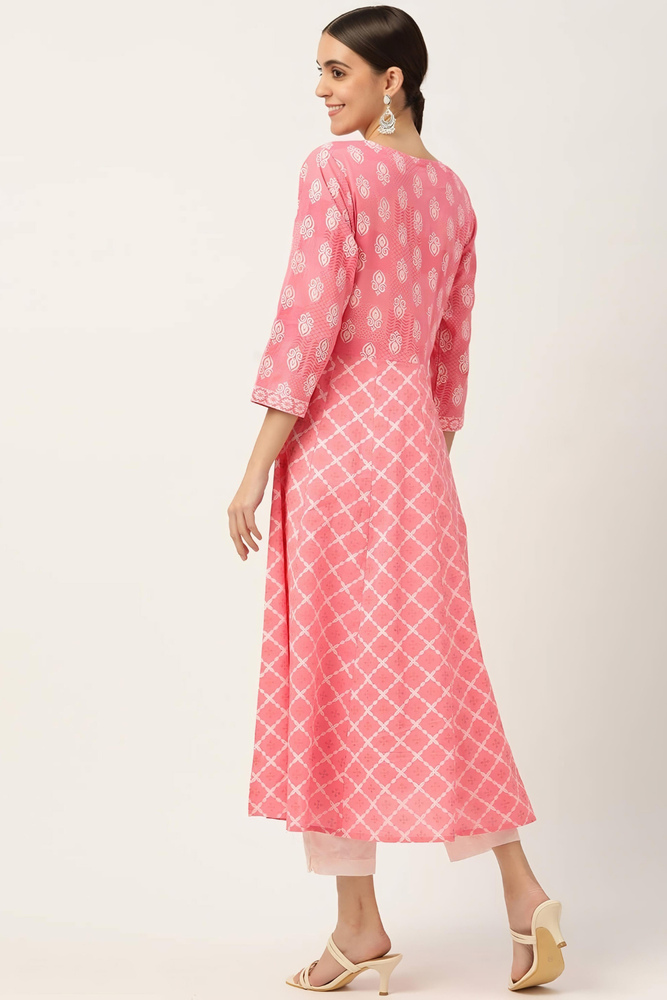 Women Pink and White Ethnic Printed Pure Cotton Kurta