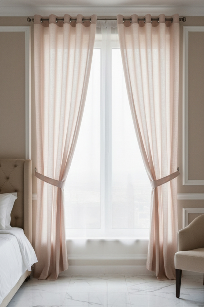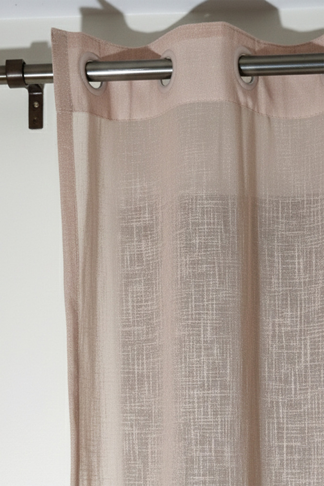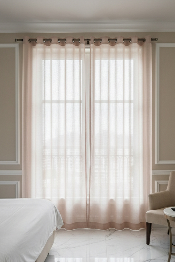 The curtain features a delicate cream, off-white shade that gives the room a fresh and soothing look. Made from lightweight chiffon (sefoune) fabric, it allows natural light to filter through gently while offering subtle privacy. The fabric has a smooth, flowing texture that drapes beautifully, adding softness and movement to the space. Its minimal, solid design makes it highly versatile and easy to pair with blackout or heavier curtains. When tied back, it frames the window gracefully; when left free, it creates a calm, breezy effect.