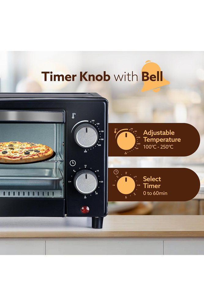 Advanced Safety and Control- Heat-resistant handle ensures a secure grip, precise cooking with a 60 minute timer and 50 to 250 degree temperature range. Optimized Capacity and Power 12 Litre capacity, Inner light with heating modes. Comprehensive Cooking Range Serves as an electric food warmer, Bake, Tikkas, Cake, Griller, Pizza oven, and more for a diversified cooking experience and kitchen OTG modern design ensures effective baking convenience.