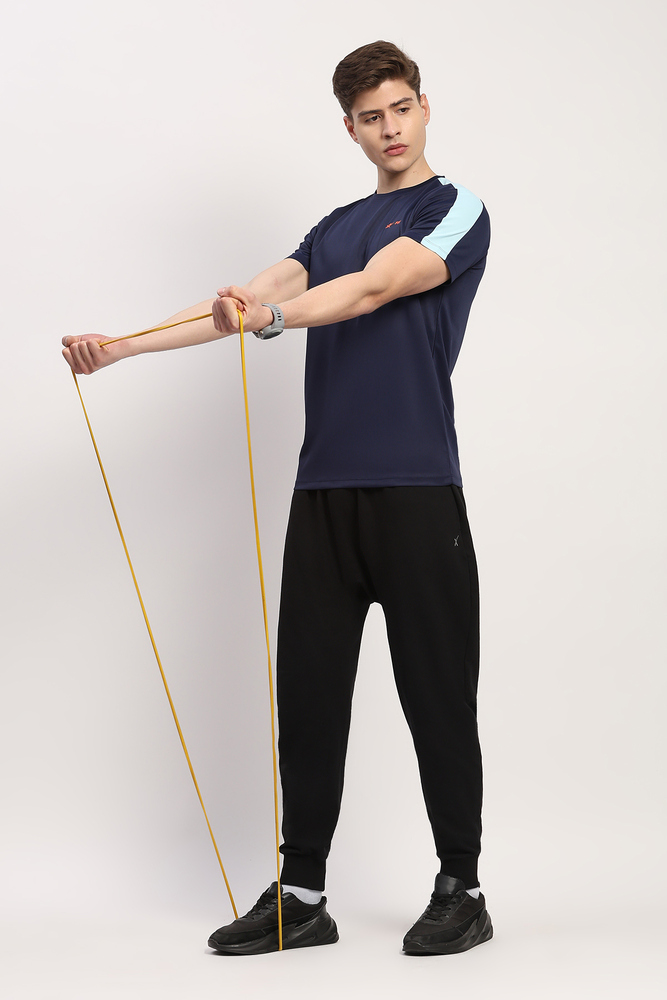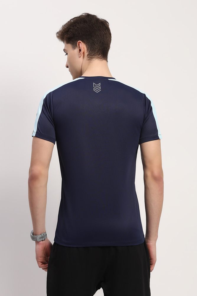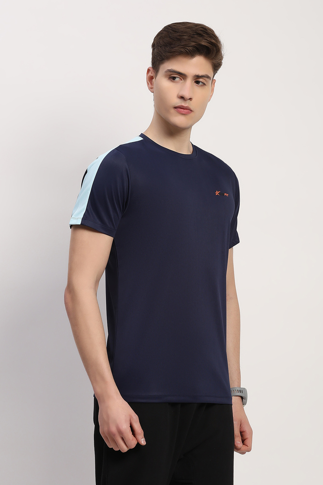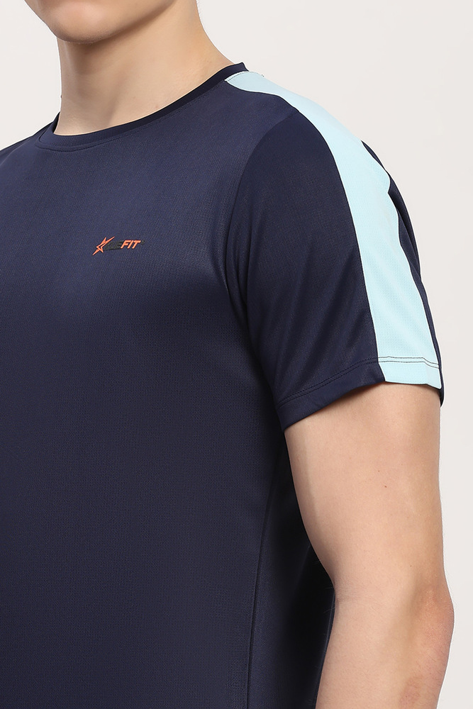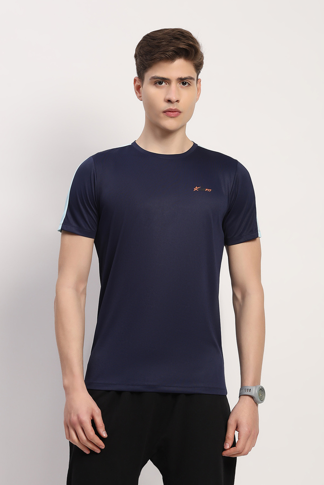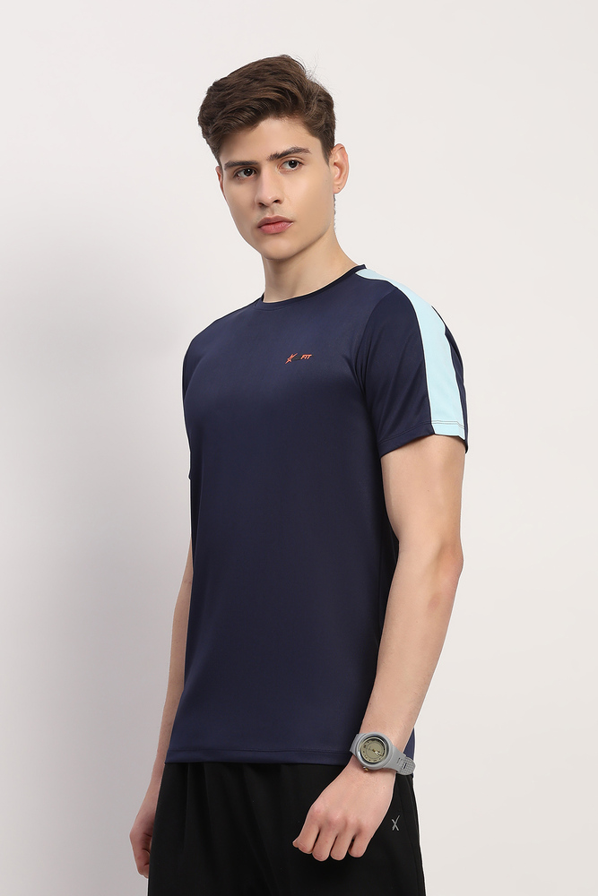 Kuefit mens navy blue plain round neck half sleeve t shirt made from stretchable polyester lycra fabric ensuring comfort durability and ease of movement perfect for casual styling office wear or daily routines. Model height is 6.1 feet wearing size M. Disclaimer - Please note that the color of the product shown on the website may differ slightly from the actual product due to factors such as lighting and screen display.