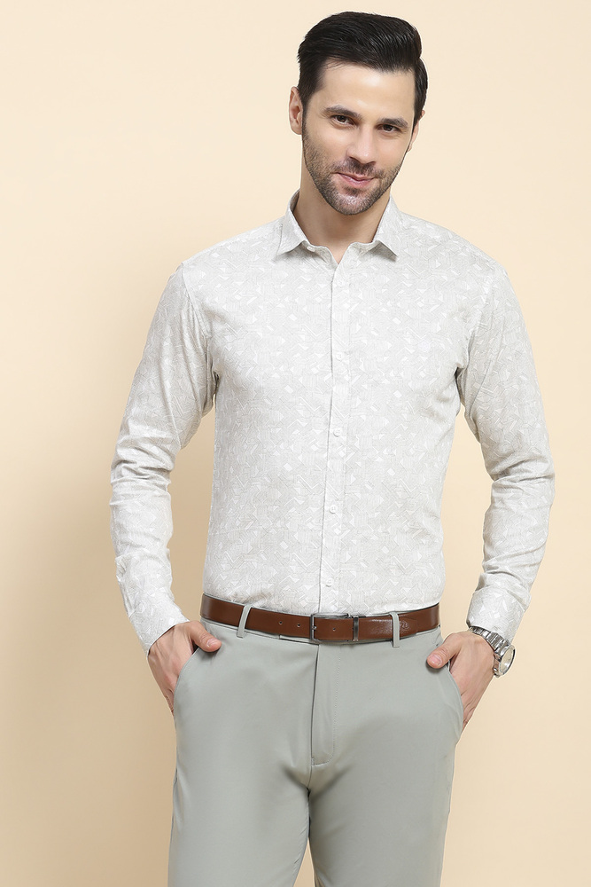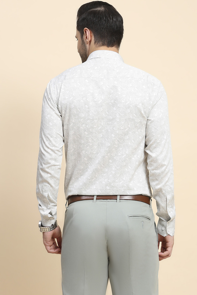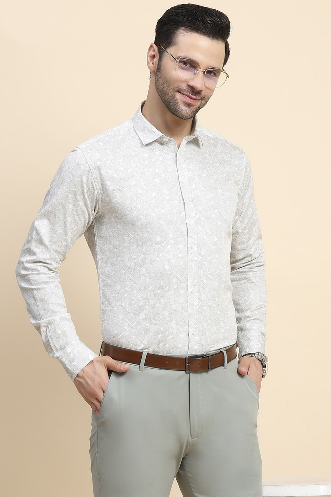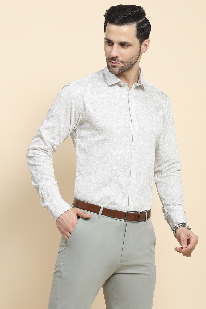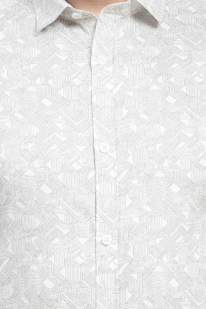 Elevate your wardrobe with this White Geometric Print Shirt, tailored from luxurious cotton for a silky smooth touch and a sophisticated sheen. The subtle geometric pattern lends a modern twist to the timeless white shirt, making it versatile for both formal and smart casual looks. Featuring a classic collar, full button placket, and impeccable tailoring, this shirt ensures comfort, style, and elegance in every wear. Model height is 6.1 feet and wearing M size. Disclaimer - Please note that the color of the product shown on the website may differ slightly from the actual product due to factors such as lighting and screen display.