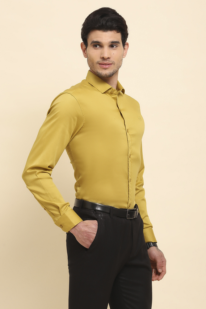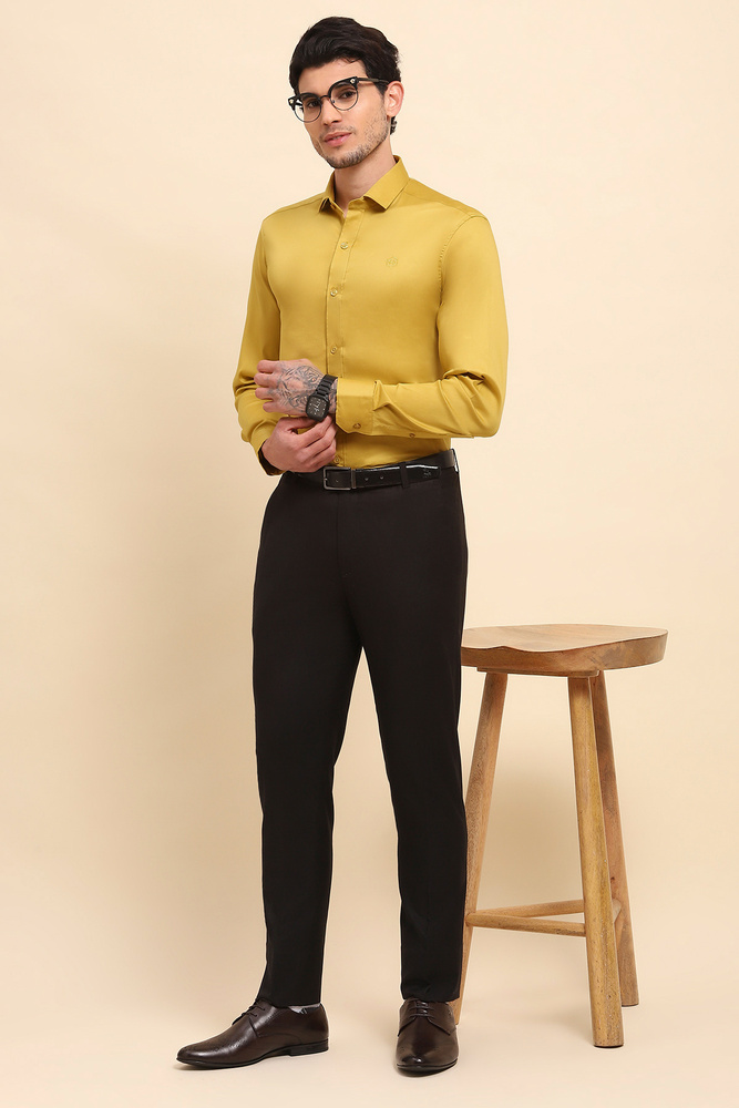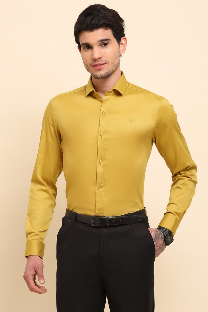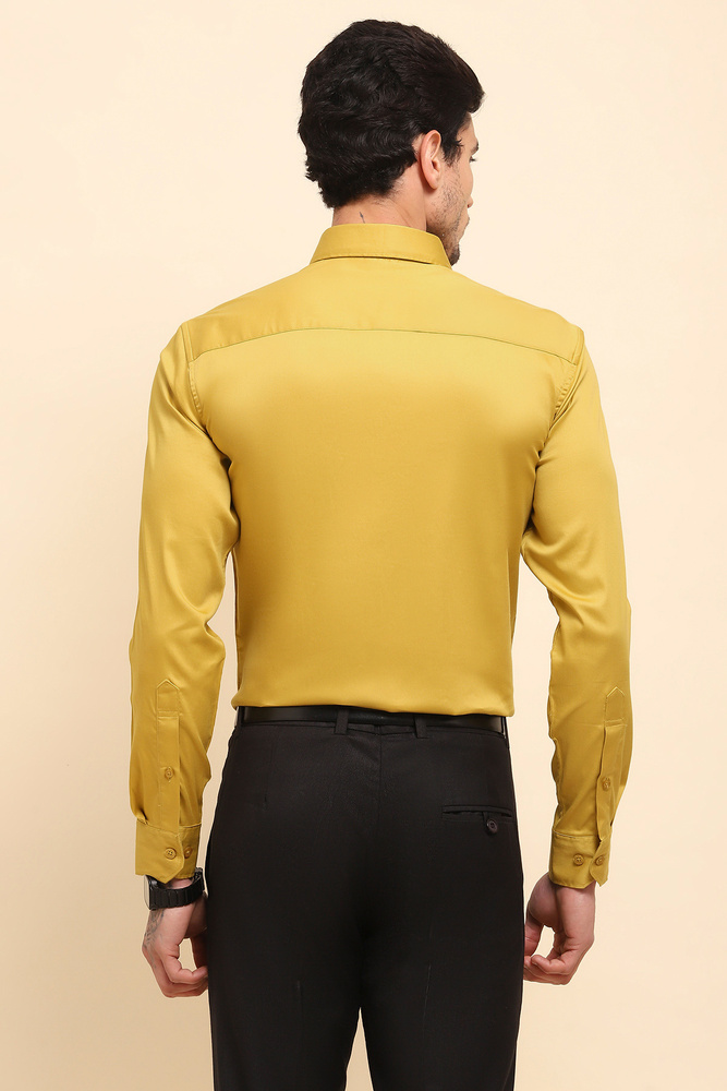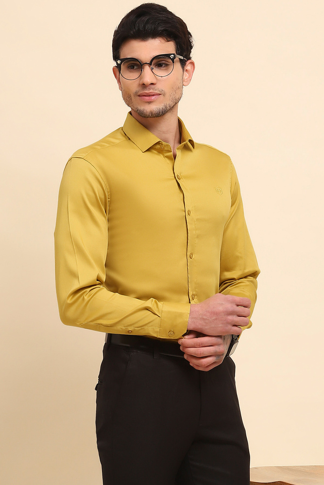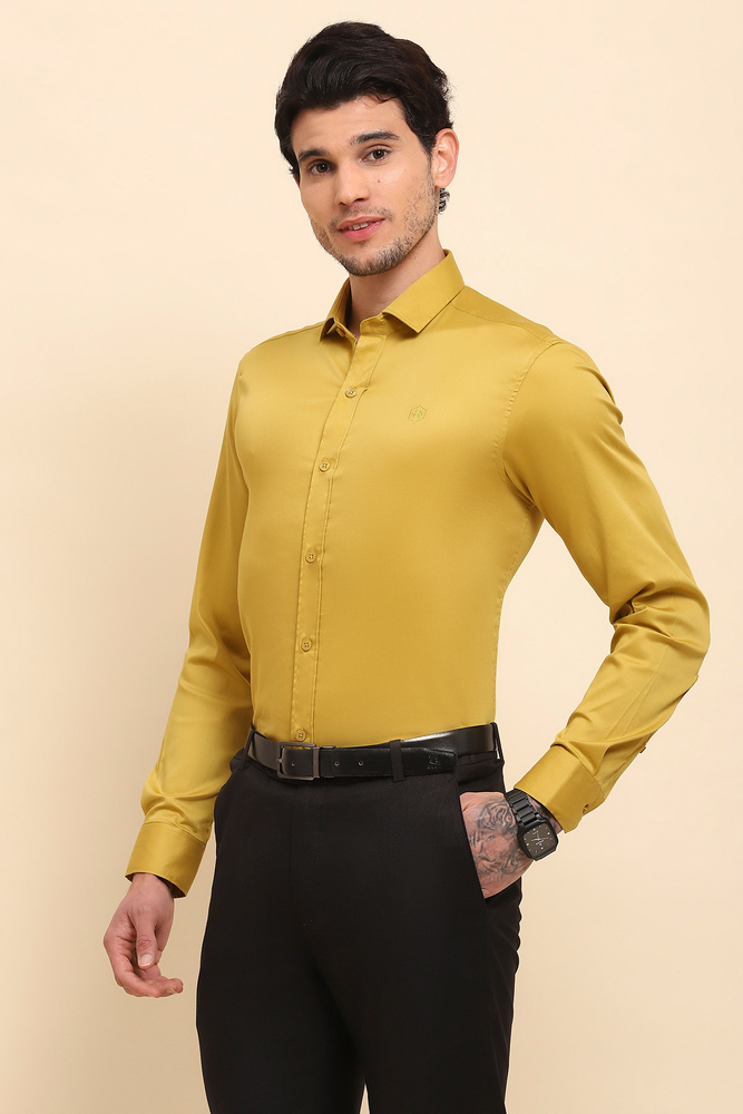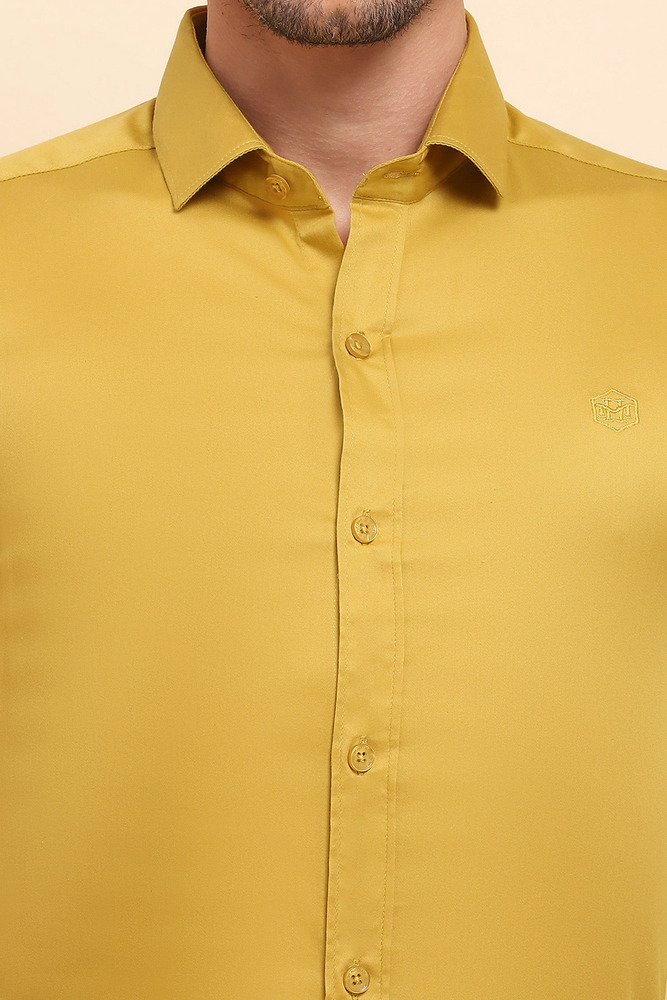 Brighten your everyday style with the Mr. Huffman Mens Mustard Yellow Solid Shirt. Constructed from 80% Cotton Satin and 20% Lycra, it offers a silky smooth touch with comfortable stretch that keeps you at ease throughout the day. The vibrant color and clean design make it a great choice for casual gatherings, smart casual looks, and relaxed workwear. Model height is 6.1 feet and wearing M size. Disclaimer Please note that the color of the product shown on the website may differ slightly from the actual product due to factors such as lighting and screen display.