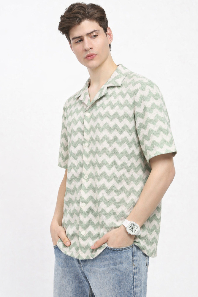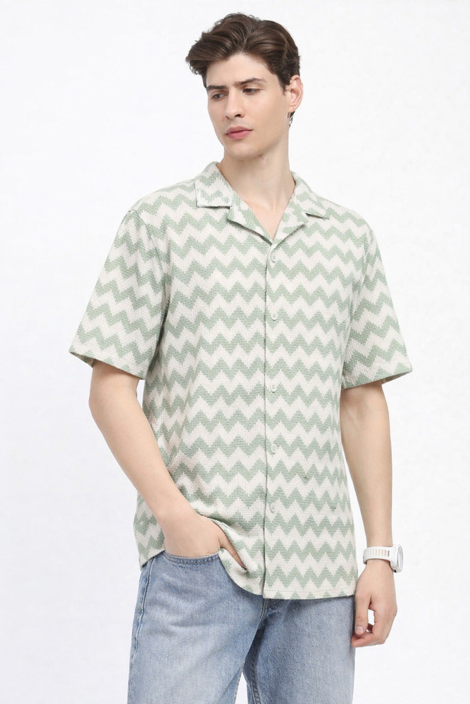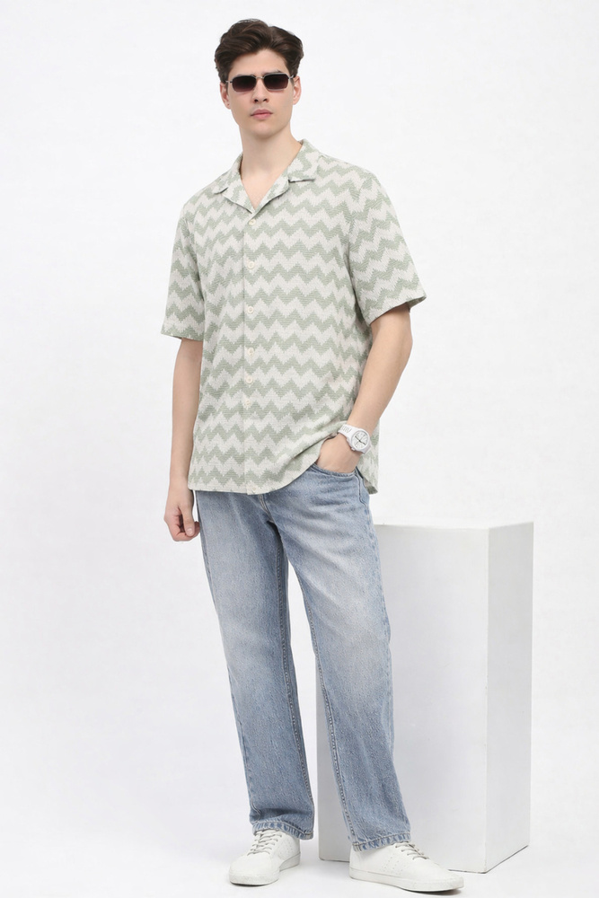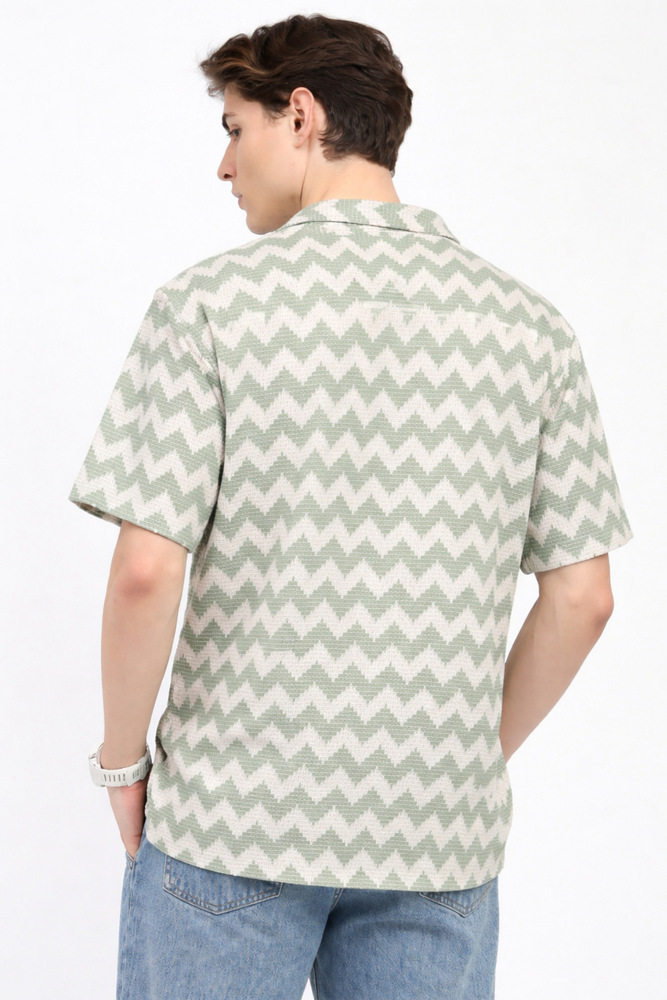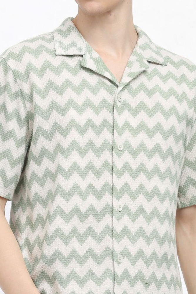 Elevate your casual wardrobe with this versatile Sage Green Chevron Resort Shirt. Crafted from a premium textured fabric, this shirt features a sophisticated zig-zag pattern that adds depth and visual interest to a classic silhouette.