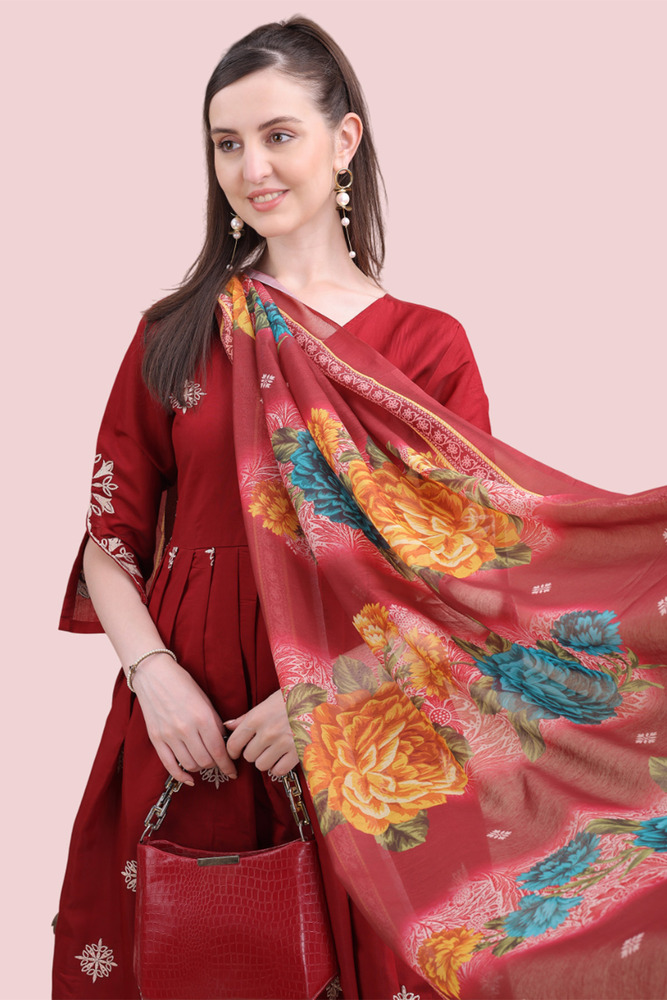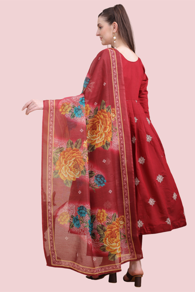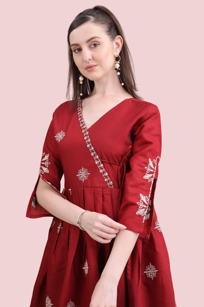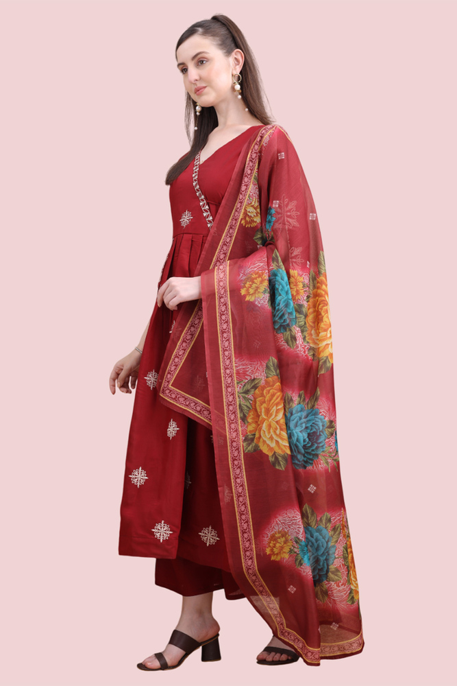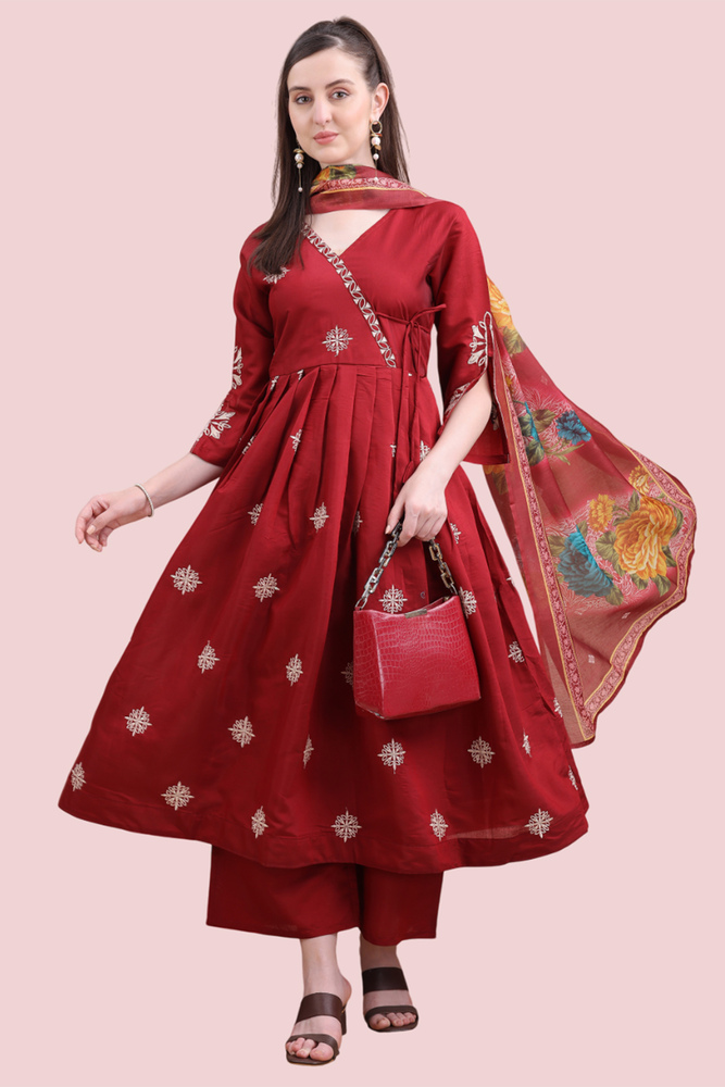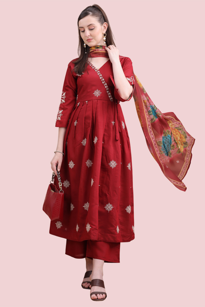 Woman Maroon Angrakha Style Anarkali Kurta With Dupatta Suit Set